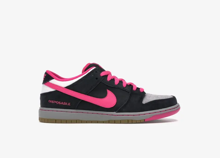 En 2004, Sean Cliver a publié Disposable : A History of Skateboard Art, un livre qui examine comment l'art et la culture du skateboard ont évolué en tandem au fil des ans. En l'honneur du 10e anniversaire du livre, Nike a sorti la Dunk Low Premium SB Qs 'Disposable'. Cette low top présente une tige en daim noir avec des superpositions grises assorties, des détails Pink Foil et le marquage "Disposable" sur le talon. NIKE SB DUNK LOW PRO