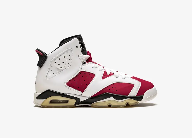 La Air Jordan 6 OG est dotée d'une tige en cuir blanc cassé de première qualité avec des perforations le long de la paroi latérale et du col pour une meilleure respirabilité. Elle est également dotée d'un système de laçage à bascule pour un ajustement personnalisé, de détails New Maroon sur la languette et le talon, et d'une unité Air partiellement encapsulée. La outsole présente un motif de traction circulaire et comporte également du caoutchouc translucide transparent pour une meilleure adhérence. AIR JORDAN VI OG