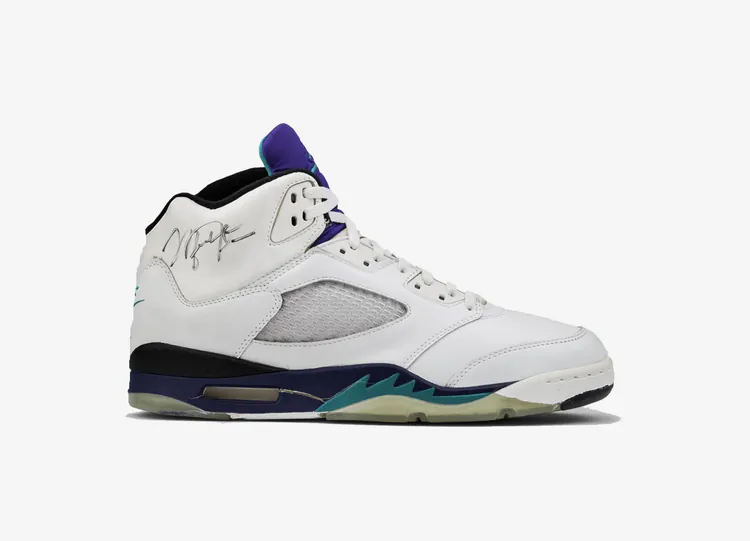 Le "Grape" d'Air Jordan 5 OG est l'un des quatre coloris originaux sortis en 1990. En renonçant aux couleurs normales des Chicago Bulls, cet AJ5 est doté d'une tige en cuir blanc et d'un panneau latéral en filet respirant. Les détails Grape Ice se trouvent sur la langue rembourrée et sur la midsole, ainsi que des accents New Emerald sur la doublure intérieure et le motif flamme de la midsole. La chaussure est dotée d'une unité Air partiellement encapsulée pour amortir le choc sur une outsole en caoutchouc translucide. AIR JORDAN V OG