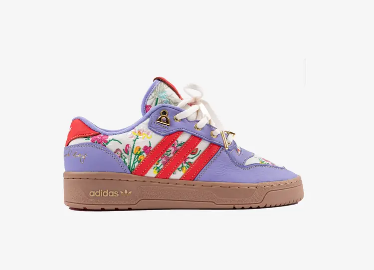 La adidas Rivalry Low 'Grandma's Ugly Couch' est issue d'une collaboration avec le magasin Unheardof de Cincinnati, dont le fondateur, Phil Lipschutz, s'est inspiré de ses souvenirs d'enfance pour la conception de la chaussure. La silhouette classique présente une tige en velours côtelé blanc cassé, recouverte d'un imprimé floral qui rappelle les géraniums, les tulipes et les roses brodés que l'on trouvait sur le canapé de la grand-mère de Phil. Le logo adidas sur la languette est inscrit dans l'écriture de la grand-mère, tandis que sa signature fréquente sur les cartes et les lettres - "Sois toujours un bon garçon" - est imprimée en lettres dorées sur le talon de couleur lavande. La chaussure basse repose sur une semelle en caoutchouc gomme, dotée d'une semelle compensée en mousse de couleur rouge vif sur le côté médian. ADIDAS RIVALRY