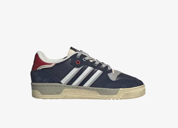 Lancée dans le cadre des "Rivalry Series" du Consortium adidas, la Extra Butter x adidas Rivalry Low "Rivalry Series - NY Rangers" habille la low-top d'une tige en cuir marine, renforcée par des superpositions en daim ton sur ton à l'avant-pied et au talon. Les trois bandes en maille blanche, accentuées par des surpiqûres en zigzag apparentes et des bordures grises, décorent le panneau arrière, tandis qu'un éclat contrasté de cramoisi apparaît sur la languette arrière en cuir. La chaussure repose sur une semelle intermédiaire en caoutchouc bicolore, avec une construction latérale surpiquée et une finition pré-déformée. ADIDAS RIVALRY