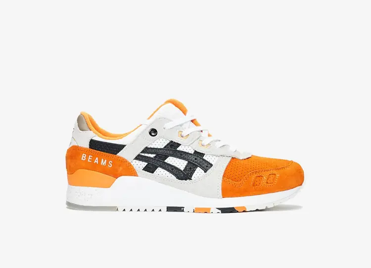 Afew et ASICS Tiger se sont associés à la boutique de sneakers japonaise BEAMS pour créer la Gel Lyte 3 'Orange Koi'. Cette itération de la chaussure de course traditionnelle présente des tons de daim orange sur le bout et le talon, tandis que d'autres touches de daim recouvrent les bandes et les panneaux de la chaussure Tiger. Les lettres BEAMS et Afew apparaissent sur le talon, tandis que la outsole présente un imprimé camouflage avec une section translucide qui affiche l'image d'un koi. Cette édition est livrée dans une boîte spéciale limitée, avec des lacets supplémentaires et une deuxième paire de semelles avec un dessin différent. ASICS GEL-LYTE III