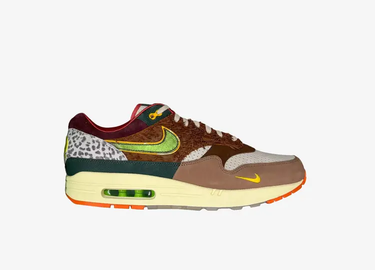 L’esthétique de cette Air Max 1 débute avec une base en mesh blanc rejointe par une symphonie de teintes multicolores. Effectivement, du jaune moutarde, du vert et du rose se déchaînent à travers la silhouette sous forme d’ondulations ponctuées par un contour en cuir gris. Les brandings sont, quant à eux, inversés et des éléments tels que le swoosh et le mudguard bénéficient d’une finition en 3M réfléchissant. NIKE AIR MAX 1 SE