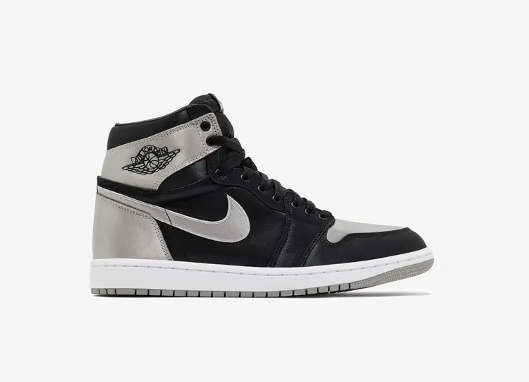La Women's Air Jordan 1 Retro High OG 'Satin Shadow' remet au goût du jour un coloris original dans une construction revisitée. Au lieu du cuir traditionnel, la tige est revêtue de satin, présentant une base noire solide avec des accents gris sur la boîte à orteils, le Swoosh, le talon et le rabat du col. Ce dernier est marqué d'un logo Wings brodé, tandis qu'une étiquette tissée Nike Air apparaît sur la languette. La sneaker repose sur une semelle en caoutchouc classique, mise en valeur par des parois latérales blanches et une semelle extérieure noire antidérapante. AIR JORDAN I RETRO HIGH