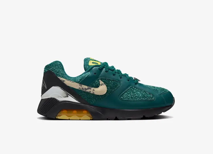 La Nigel Sylvester x Air Jordan 4 RM SP 'Grandma's Driveway' présente la version rafraîchie de la star du BMX sur le quatrième modèle signature de Michael Jordan. Une teinte émeraude foncée imprègne l'empeigne, fabriquée en daim avec une cage TPU de soutien. Un mini-Swoosh blanc est brodé sur l'avant-pied latéral, tandis que la mention "Bike Air by Jordan" est inscrite sur la languette. Un logo Bike Air en relief orne le talon arrière. La sneaker repose sur une semelle intermédiaire AJ4 bicolore, finie dans les tons noir et blanc cassé et augmentée d'un coussin d'air visible. AIR JORDAN IV RM SP