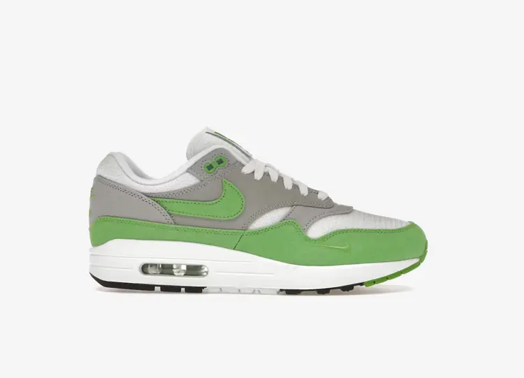 L'édition 2024 de la Patta x Nike Air Max 1 'Chlorophyll' remet au goût du jour une collaboration très convoitée en l'honneur du 20e anniversaire du label basé à Amsterdam. Sortie à l'origine en 2009, la chaussure rétro est dotée d'une tige en mesh blanc et d'un empiècement en cuir gris au milieu du pied. Le textile vert vif est utilisé pour la signature Swoosh et le garde-boue. Un mini-Swoosh ton sur ton est brodé sur l'avant-pied latéral, tandis que la marque Patta apparaît sur l'étiquette tissée de la languette et sur la semelle intérieure. NIKE AIR MAX 1