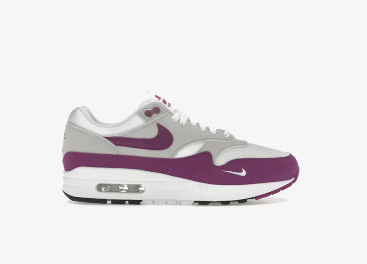 Lancée dans le cadre d'un pack de quatre chaussures, la Supreme x Nike Air Max 1 '87 SP 'Varsity Purple' présente une tige en cuir violet superposé avec un Swoosh en peau de serpent en cuir blanc contrasté. Un mini-Swoosh brodé orne l'avant-pied latéral. En plus d'une étiquette co-brandée sur la languette, les détails uniques comprennent des dubras de lacets Supreme et l'inscription « World Famous » sur le talon arrière. L'amorti léger est assuré par une semelle intermédiaire en polyuréthane blanc avec une unité Max Air apparente au niveau du talon. NIKE AIR MAX 1 87