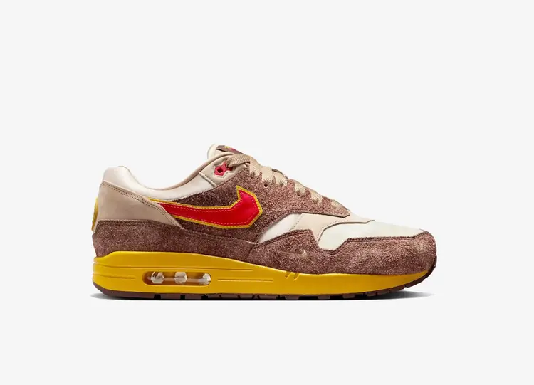 Sortie exclusivement sur .SWOOSH, la plateforme web3 de Nike, la Nike Air Max 1 'Low Poly - Big Head Origins' rend hommage au personnage emblématique des jeux vidéo Donkey Kong. L'empeigne combine un mesh de couleur kaki avec des superpositions renforcées en cuir fauve et en daim poilu marron, avec des lignes polygonales en guise de clin d'œil aux jeux vidéo vintage. Le Swoosh rouge est entouré d'une bordure jaune, une combinaison de couleurs qui se retrouve sur la languette pixelisée de la Nike Air Max. Les semelles intérieures personnalisées comportent des pièces de monnaie DS et un graphique de peau de banane. NIKE AIR MAX 1 86