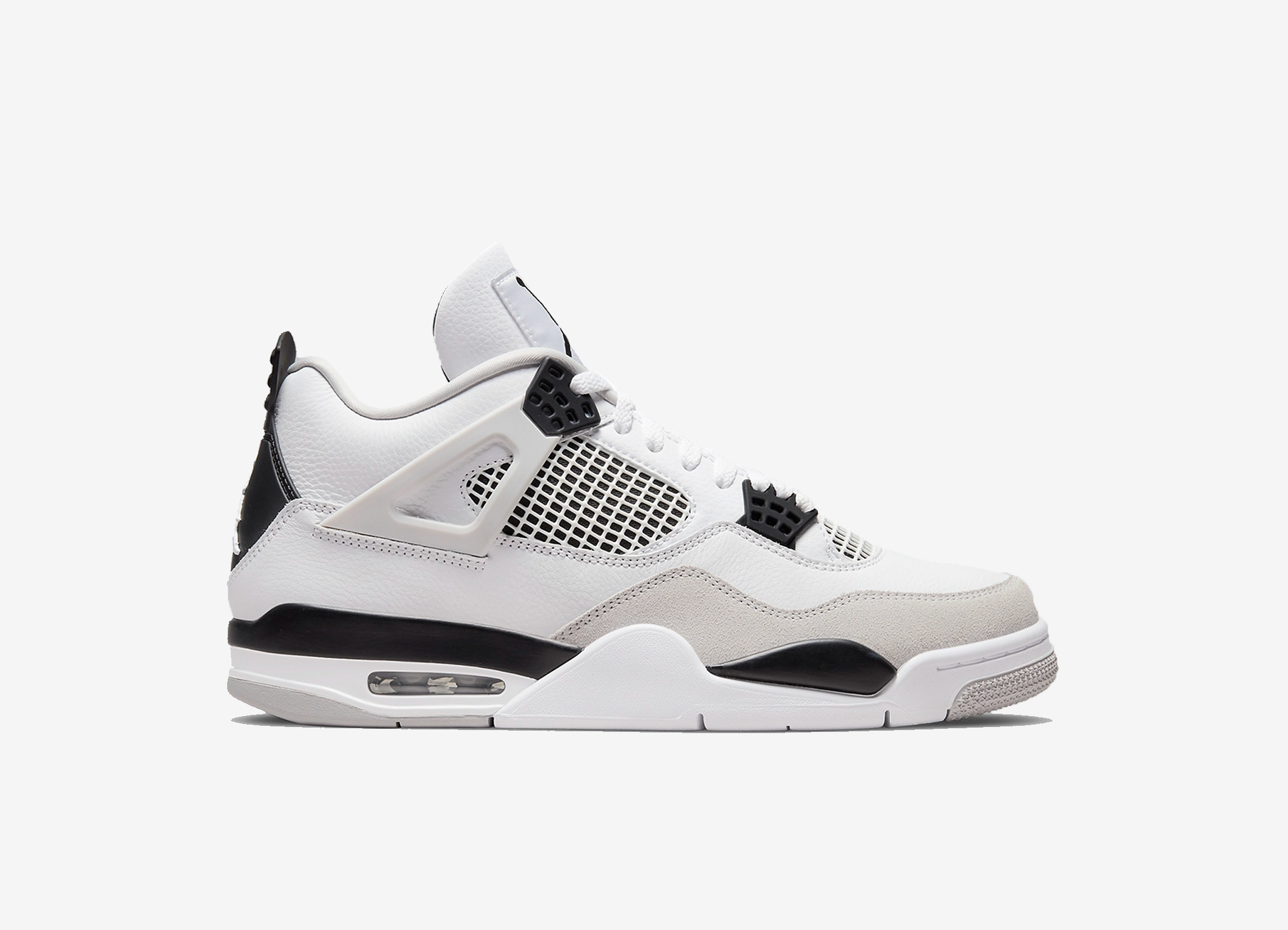 La Air Jordan 4 Retro 'Military Black' présente les mêmes couleurs et matériaux que la version OG 'Military Blue' de 1989. Du cuir blanc lisse est utilisé sur la partie supérieure, renforcé par une couche de daim gris à l'avant du pied. Des accents noirs contrastés se retrouvent sur les œillets en TPU, la languette moulée du talon et le logo Jumpman affiché sur la languette tissée. La légèreté de l'amorti est assurée par une semelle intermédiaire en polyuréthane bicolore, rehaussée d'une unité Air-sole visible sous le talon.