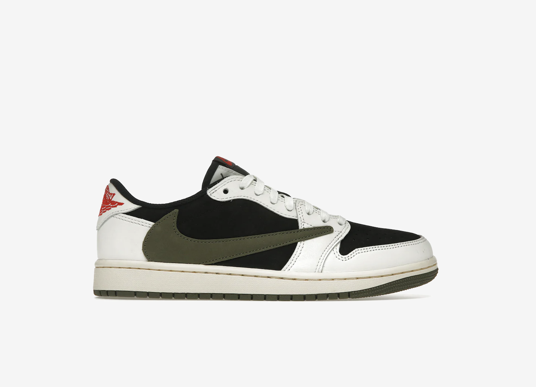 La Air Jordan 1 Retro Low OG 'Olive' Travis Scott x Women's est la première collaboration du rappeur en tête des hit-parades dans une taille féminine. La tige combine une base en daim noir avec des superpositions en cuir blanc cassé et des Swooshes en daim olive, avec un motif à carreaux inversé sur le côté latéral et un motif traditionnel sur le côté opposé. Les tons neutres sont ponctués d'accents cramoisis audacieux, soulignés par des étiquettes Nike Air tissées sur la languette et des marques Jordan et Cactus Jack dépareillées sur chaque languette du talon. L'ancrage de la low-top est assuré par une semelle en caoutchouc qui associe des parois latérales blanc cassé vintage à une semelle extérieure en caoutchouc vert olive.