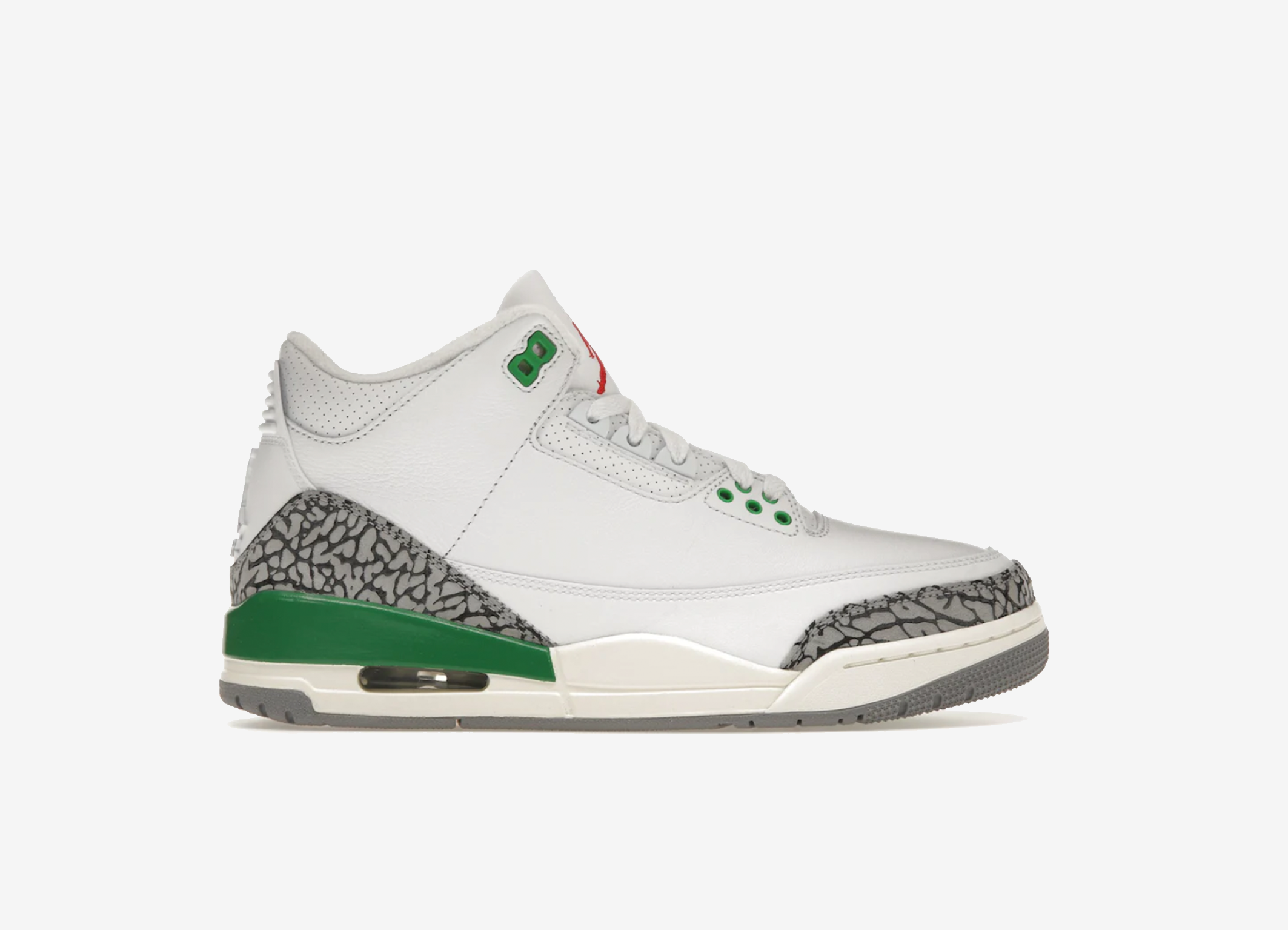 La Air Jordan 3 Retro 'Lucky Green' pour femme ajoute des accents luxuriants à la silhouette classique qui a introduit l'impression d'éléphant emblématique de Tinker Hatfield dans la ligne Jordan. Le motif distinctif apparaît sur les superpositions Cement Grey à l'avant-pied et au talon, contrastées par une tige en cuir tambouriné dans une finition blanche impeccable. Des touches vibrantes d'émeraude apparaissent sur les œillets de l'avant-pied et la semelle intermédiaire en polyuréthane de la sneaker, équipée d'une semelle Air visible au niveau du talon. La marque Jumpman orne le talon moulé et la languette, cette dernière étant agrémentée d'une touche inattendue de Varsity Red.