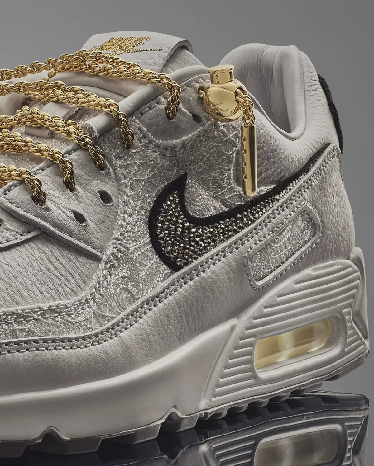 Victor Solomon n’approche jamais une silhouette comme un simple objet. Il la traite comme une structure, un symbole, une surface capable de raconter une histoire plus vaste que son propre design. Pour 2026, l’artiste américain transpose son univers sculptural sur l’une des icônes les plus intemporelles de Nike : la Air Max 90. Le résultat n’est pas une simple collaboration, mais une série conceptuelle où la sneaker devient métaphore — de la ville, du prestige et du jeu.