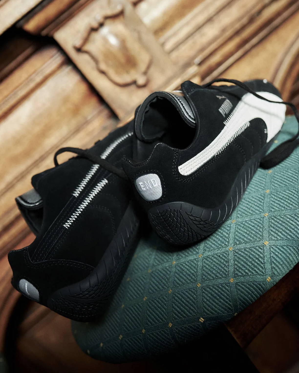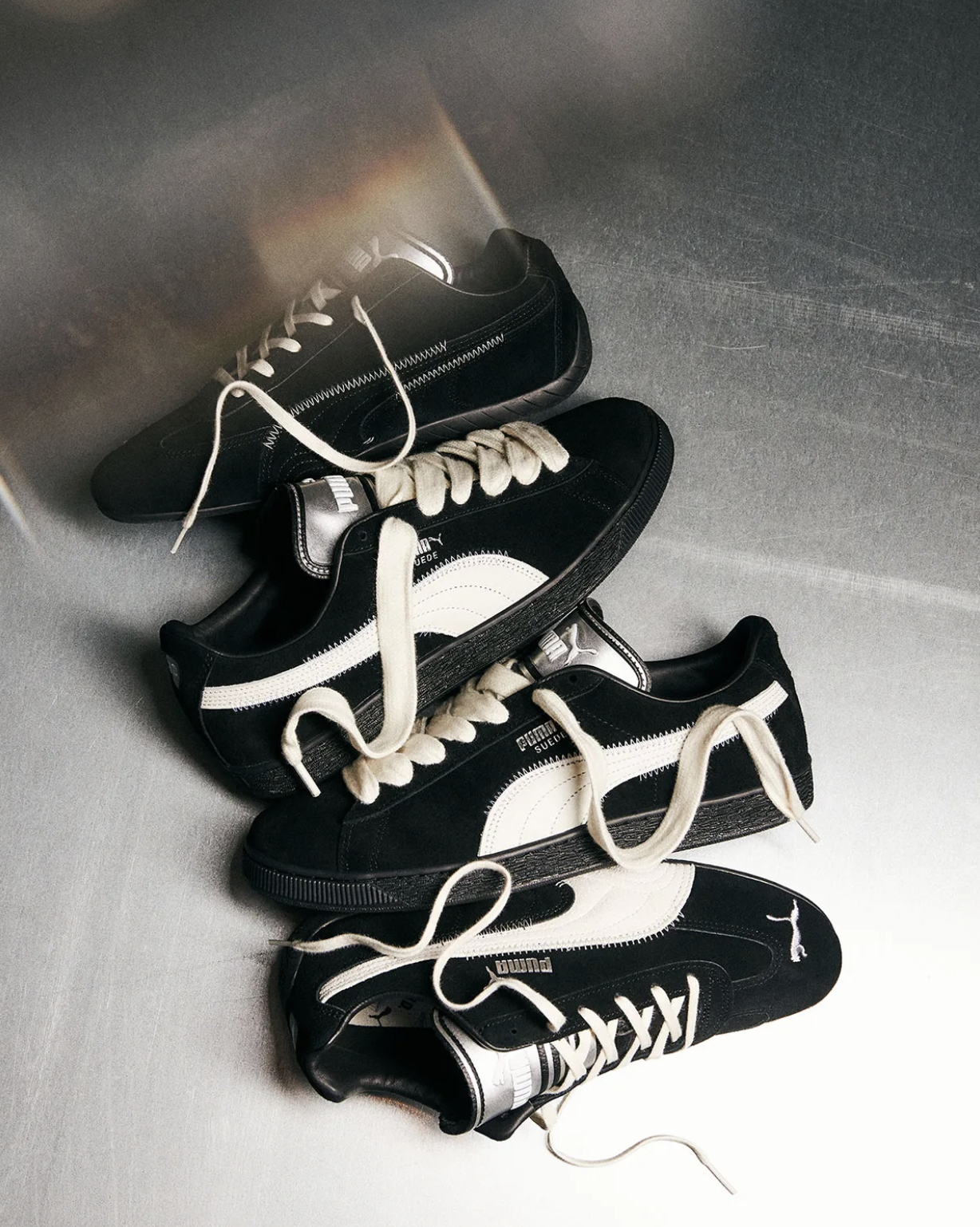 Pour le 20ᵉ anniversaire de la boutique londonienne END., PUMA s’associe pour réinterpréter deux icônes — la Speedcat et la Suede — dans une capsule marquée par le minimalisme et l’heritage. L’édition Speedcat se pare d’une finition noire sobre, contrastée par des détails en “Warm White” et un traitement suède premium qui rappelle l’élégance brute des originaux.