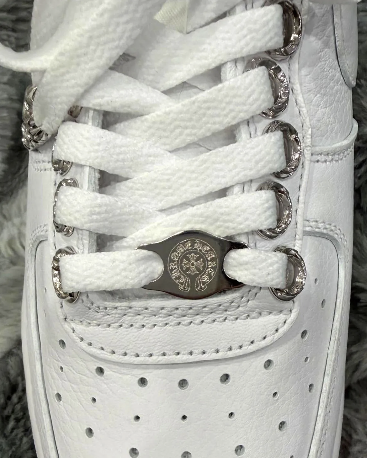 • Les lacets eux‑mêmes sont texturés, rappelant une chaîne fine — subtil clin d’œil aux bijoux Chrome Hearts — et la languette porte une étiquette co‑brandée Chrome Hearts / NOCTA en relief.