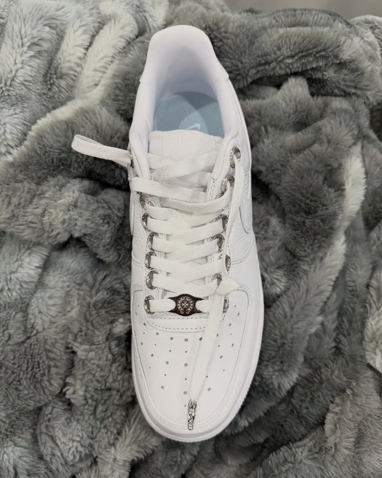Visuellement, cette AF1 ne se contente pas d’être sombre : elle s’impose par contraste, texture et présence matérielle. Le noir n’est pas uniforme : il est stratifié, presque sculptural. Les détails métalliques ajoutent de la profondeur, créent des jeux de lumière ténus qui se déploient à chaque mouvement, faisant écho à l’artisanat haut de gamme de la maison Chrome Hearts.