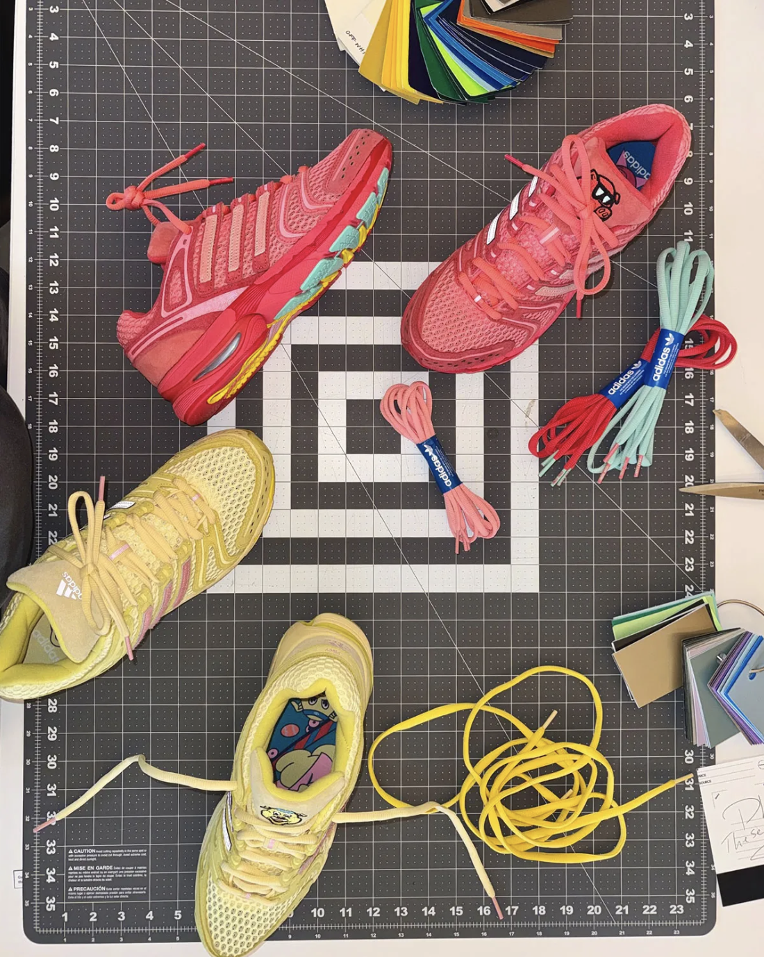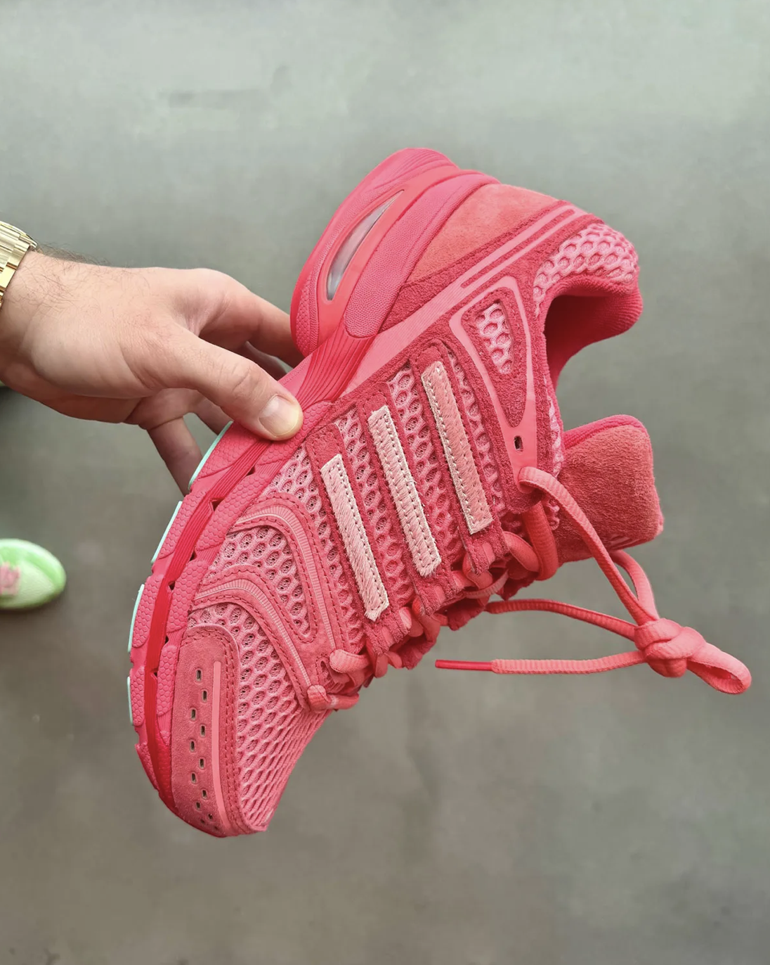 Une troisième version — dévoilée plus tôt lors de la Paris Fashion Week — introduit une palette verte avec des bandes roses, prouvant que la série ne se limite pas à une seule interprétation visuelle. Le projet semble volontairement expérimental, oscillant entre runner rétro et objet graphique.