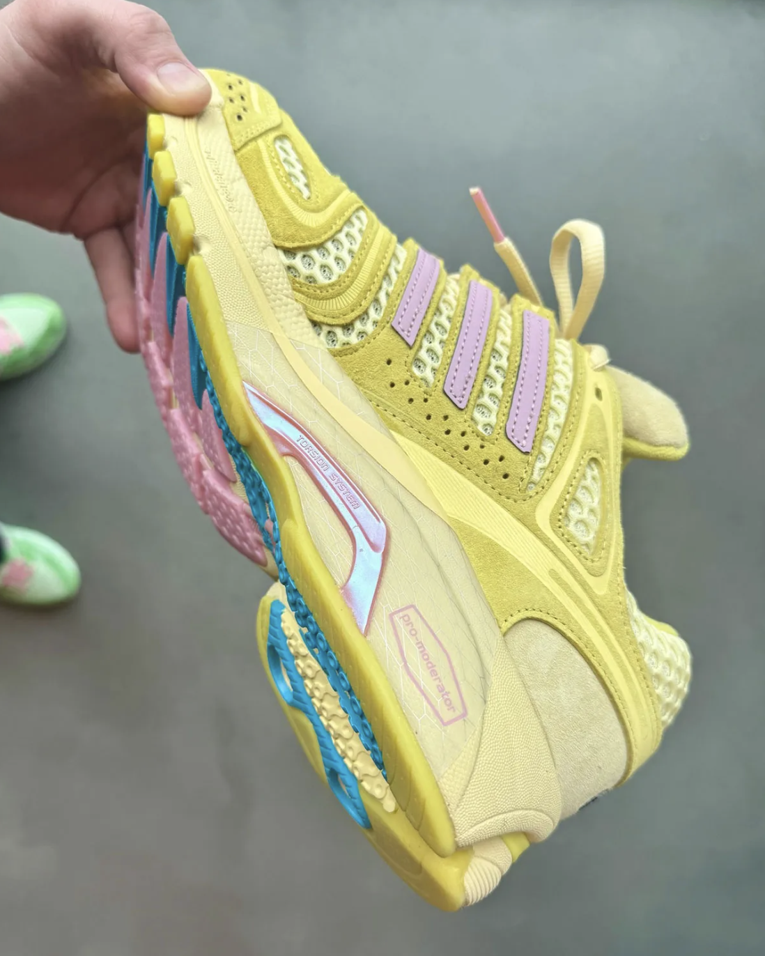 La Adistar Control 5, modèle running des années 2000 remis en lumière récemment par adidas, offre un terrain idéal pour cette réinterprétation. Sa construction technique — mesh respirant, overlays structurés et semelle épaisse inspirée du running performance — apporte une base solide à l’esthétique playful de la collaboration.