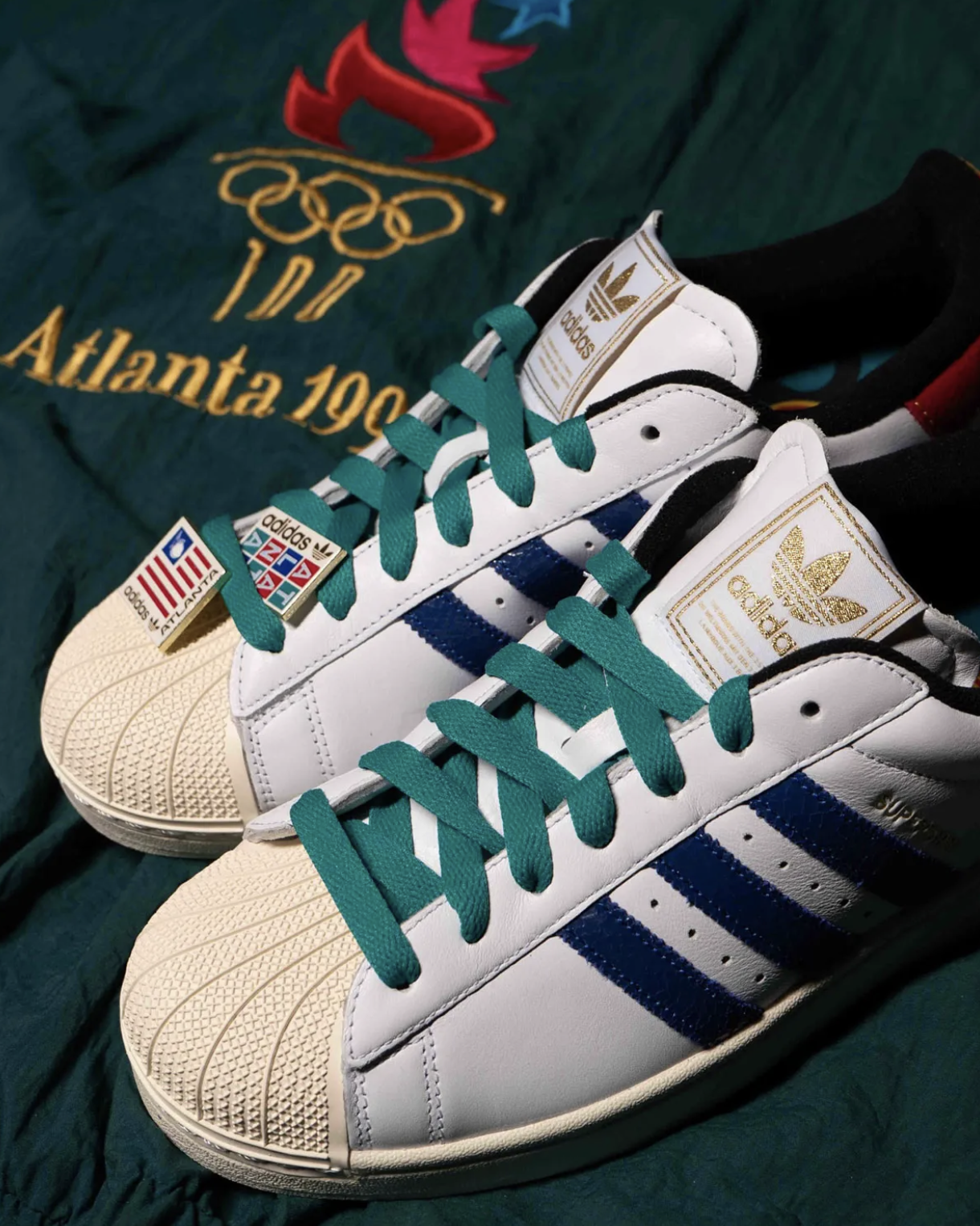 À l’inverse, la Superstar adopte une approche plus contenue. Une base blanche classique, rehaussée de détails crème sur la shell toe et la semelle, est contrastée par des bandes bleues et des touches de teal sur les lacets et le heel tab. Une lecture plus minimaliste, mais toujours ancrée dans le thème global du pack.