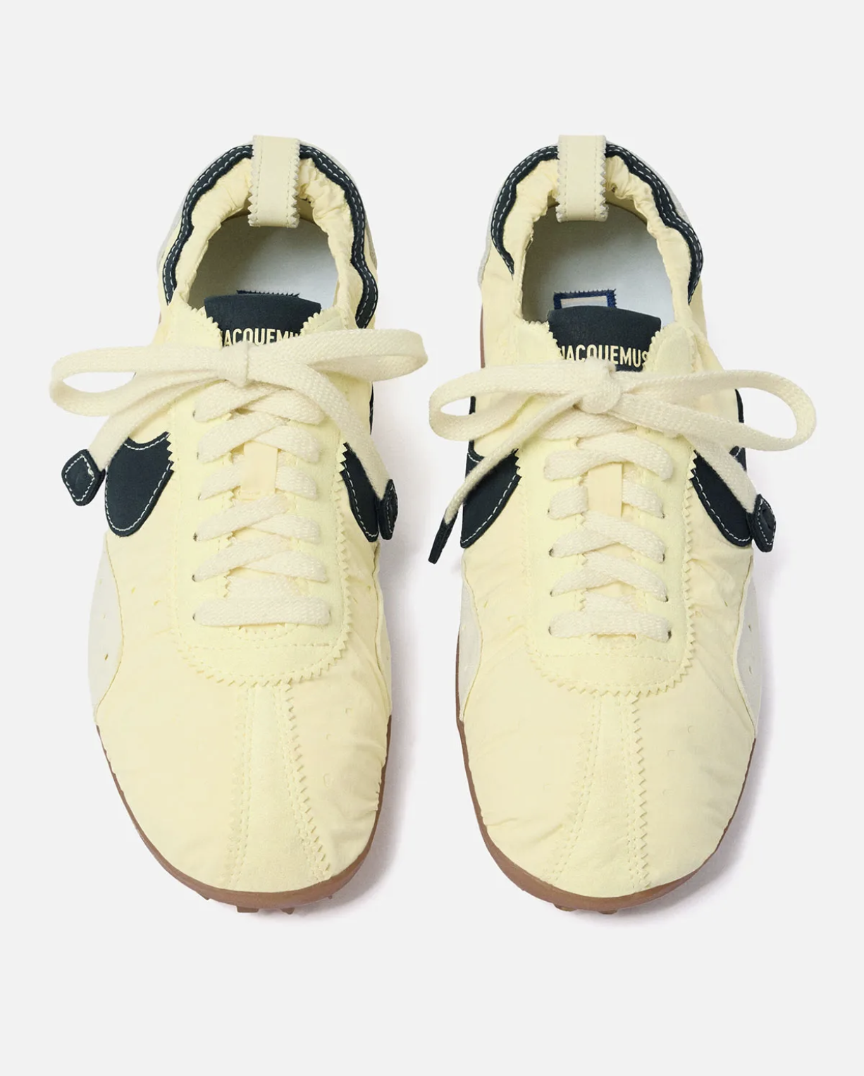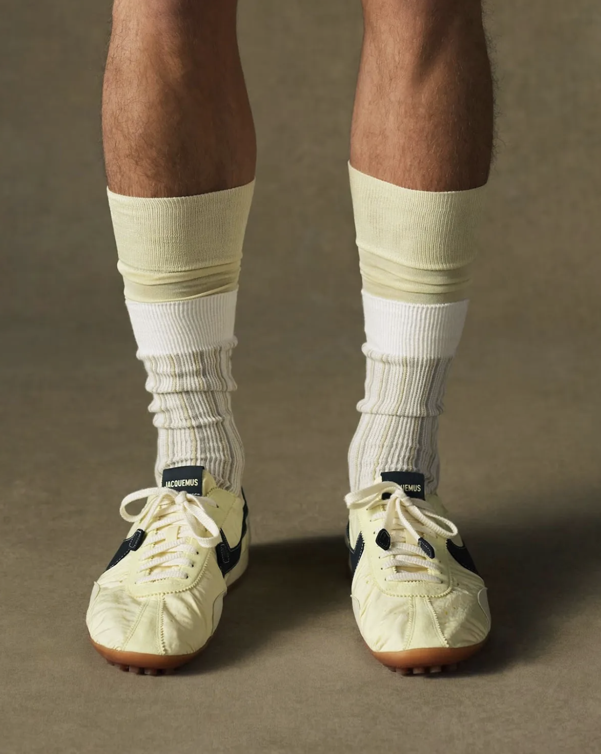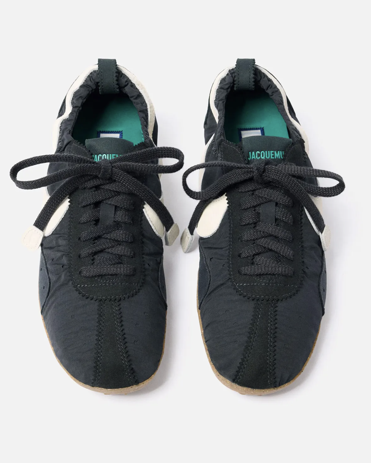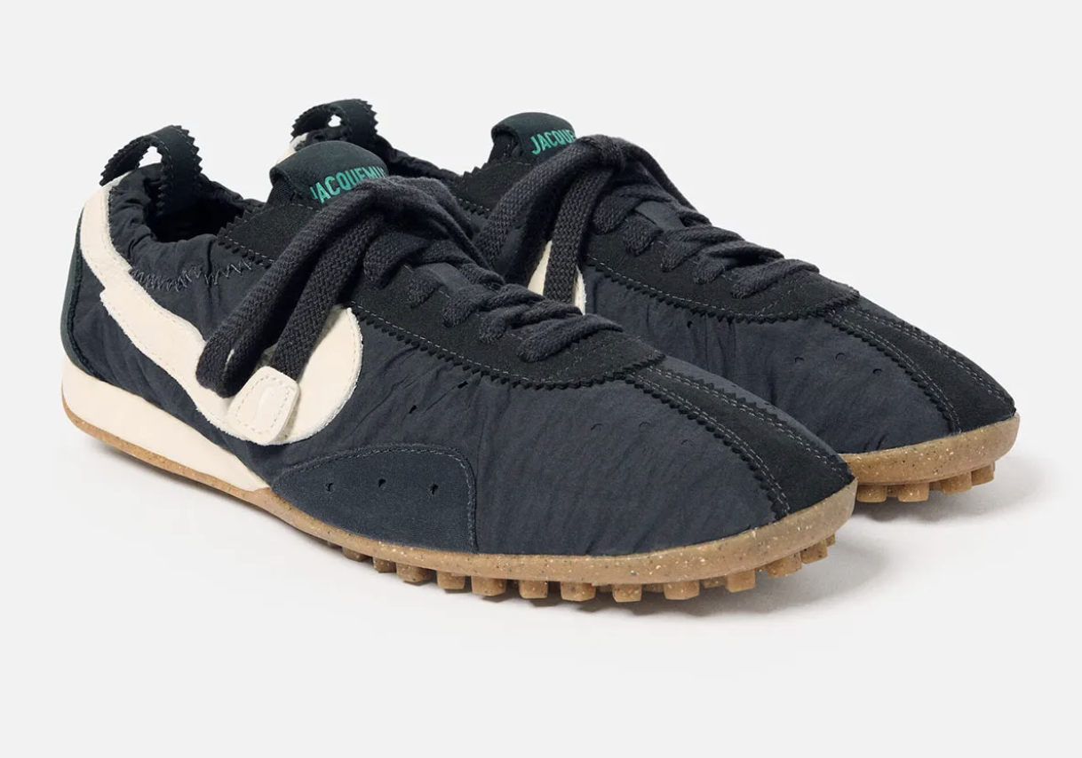 Cette version moderne garde la construction en nylon caractéristique, avec une cheville ajustée et un col semblant cintré pour un porté presque chausson. Le branding Jacquemus apparaît sur la languette, tandis que le contre-talon en suède arbore discrètement le nom, comme un rappel de ses origines. Trois coloris sont annoncés : un noir profond, un rouge universitaire vif, et un blanc cassé doux, chacun reposant sur une semelle gum au look rétro patiné, fidèle à l’esprit vintage de la paire.