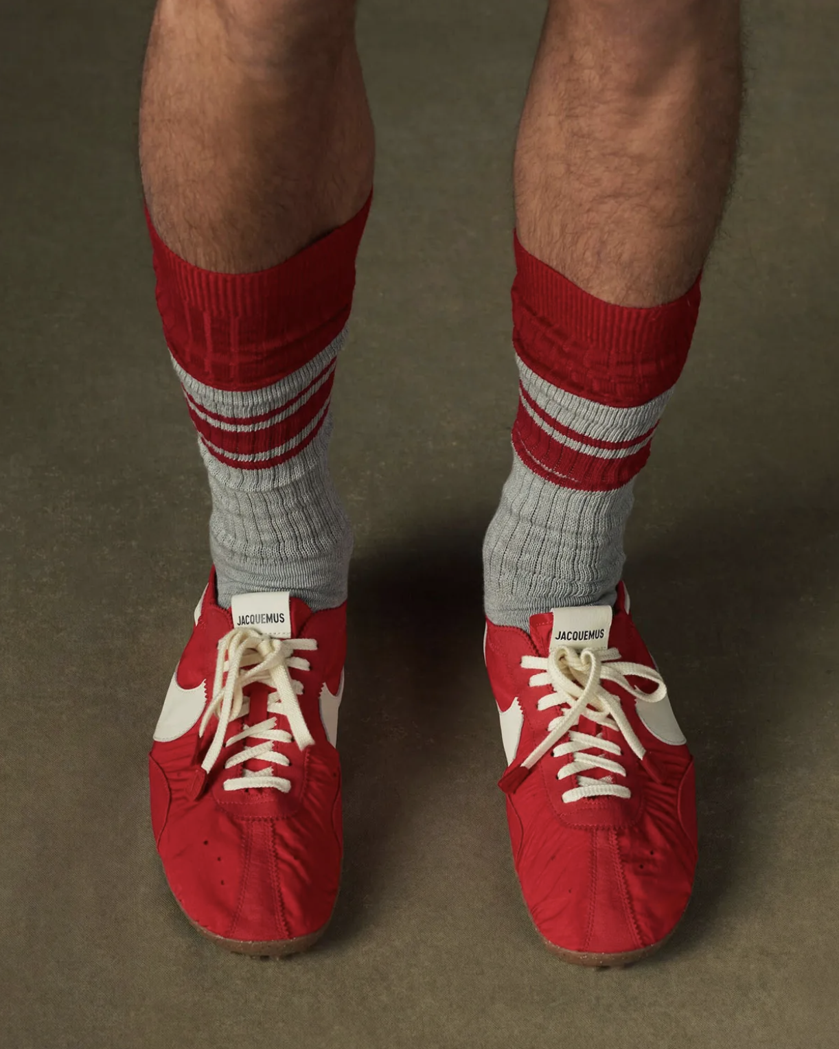 Jacquemus fait revivre ce qui pourrait être la première sneaker de l’histoire de Nike : la Moon Shoe, créée en 1972 par Bill Bowerman. Cinquante ans plus tard, la silhouette emblématique revient dans une collaboration pensée comme un vestige mythique, reconnue pour sa semelle “waffle” qui laissait des empreintes semblables à celles des astronautes.