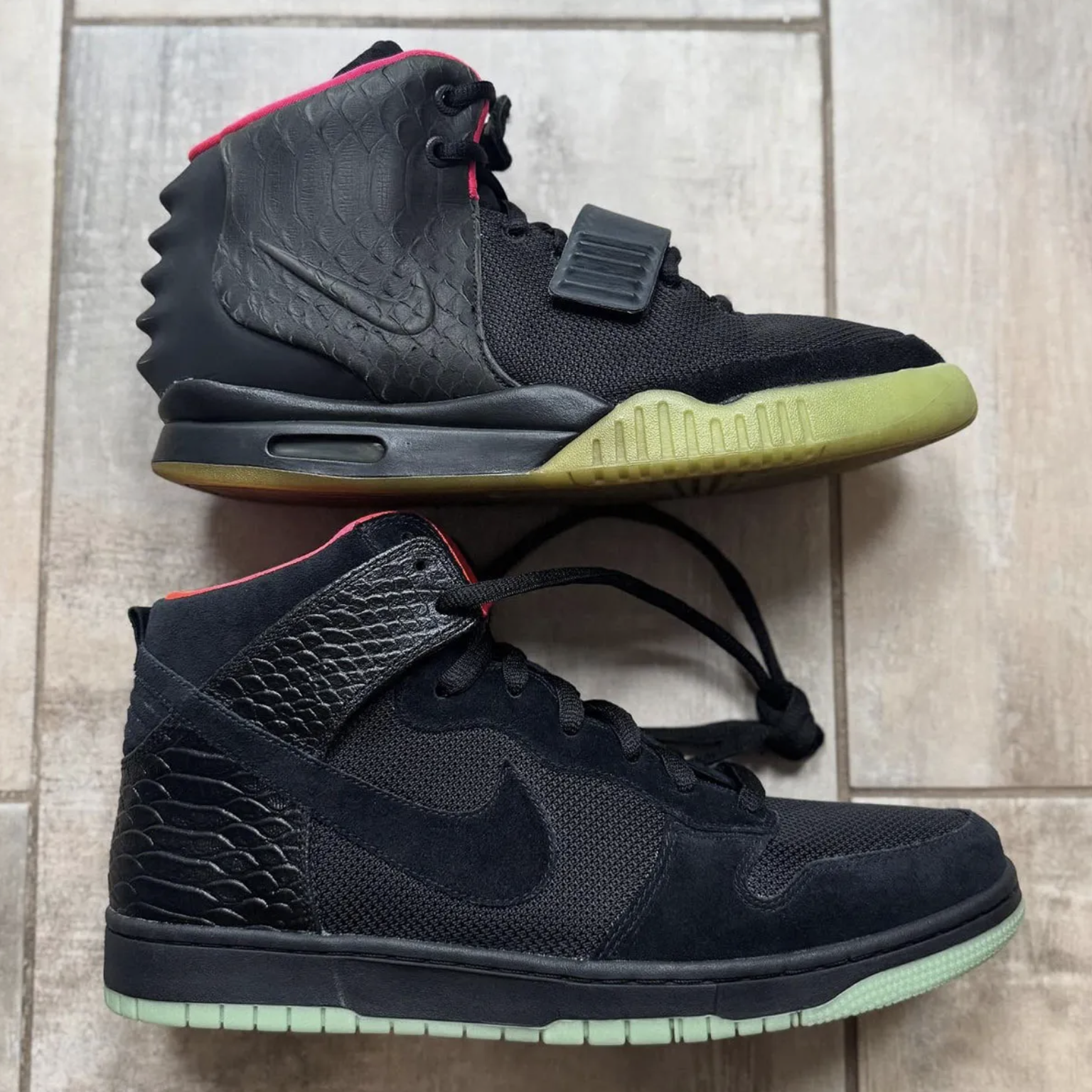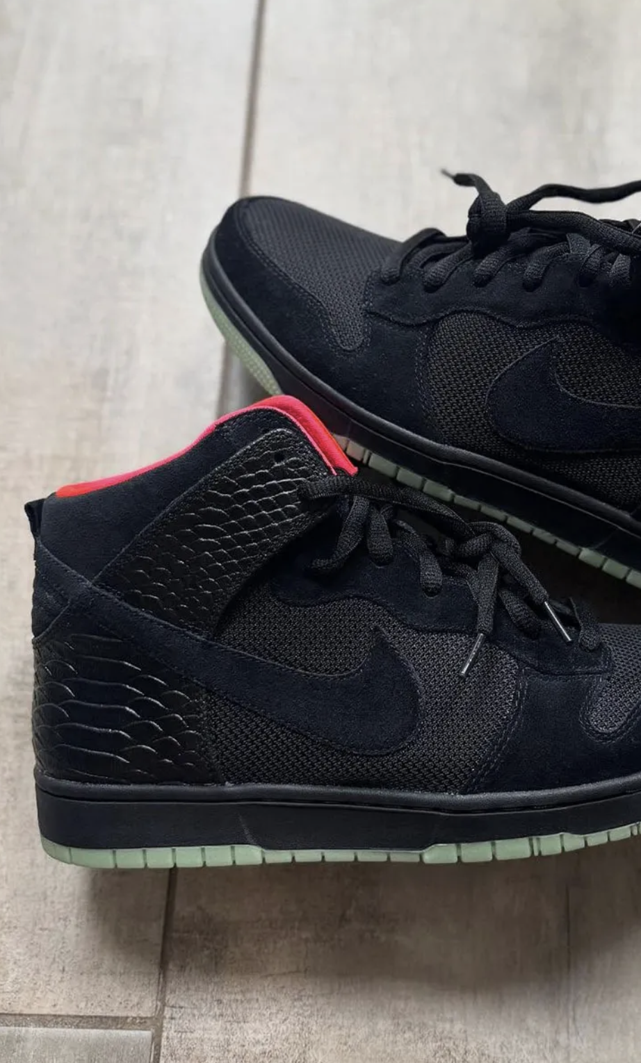 Un sample inédit vient de surgir : un Nike Dunk High “Solar Red”, inspiré directement de la Yeezy 2 “Solar Red”. On y retrouve les codes visuels de l’original — intérieur rouge vif, semelle semi-transparente verte — mais transposés sur une silhouette Dunk : tige noire mixant suede, mesh et détails façon croco au talon.
