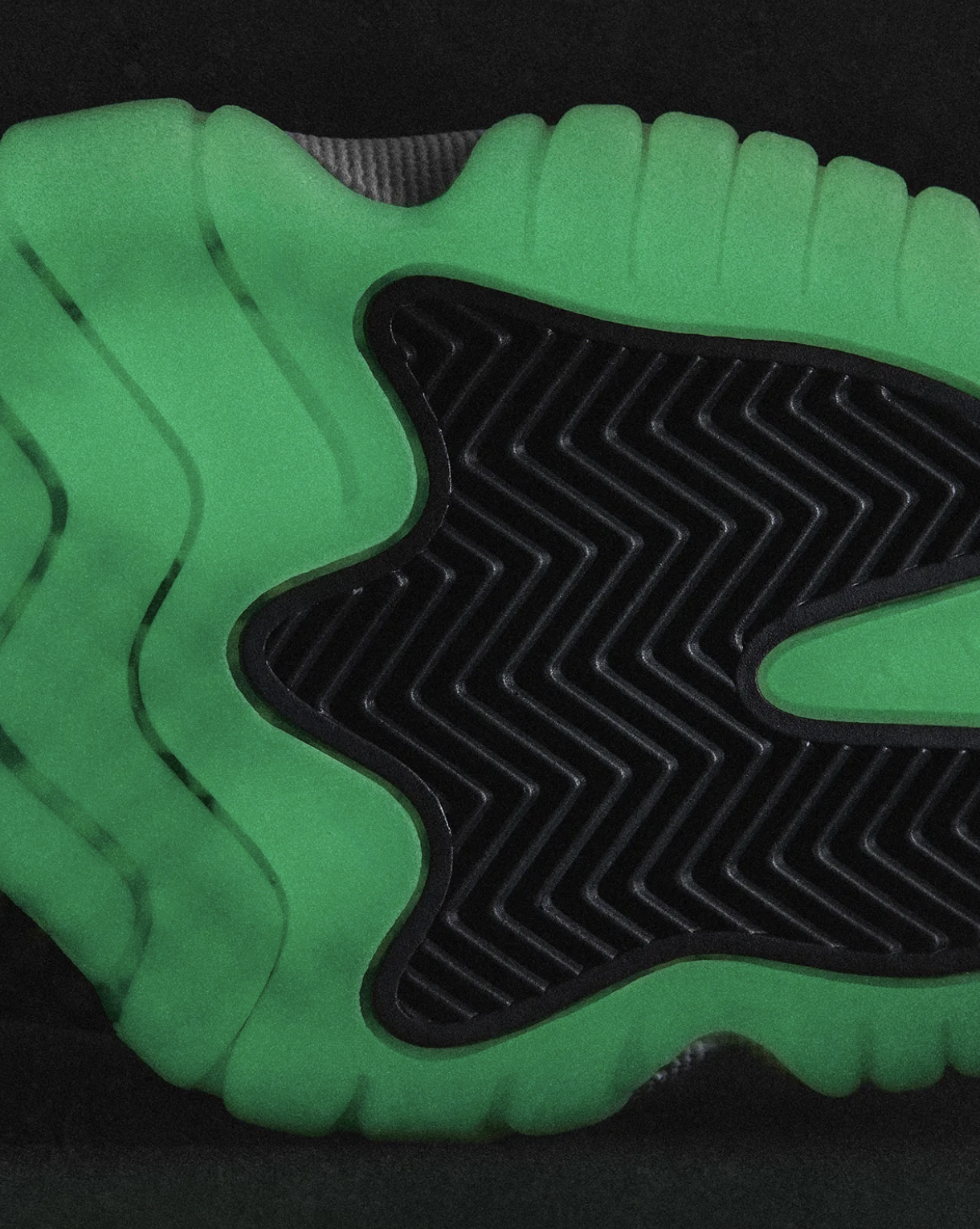Jordan Brand continue la célébration des 30 ans de la AJ11 avec une version pensée exclusivement pour les plus jeunes : la “Inner Beast”. Inspirée du surnom animalier de Michael, le fameux “Black Cat”, cette déclinaison se double d’un clin d’œil appuyé à Halloween 2025. La silhouette se présente dans un gris sombre et brumeux, avec un mudguard texturé façon pelage rugueux, tandis que le Jumpman se voit lacéré de griffures félines. La semelle, elle, s’illumine dans l’obscurité grâce à un glow-in-the-dark spectaculaire — comme une empreinte laissée sous la lune. Plus qu’une simple paire, c’est une métaphore : celle de la bête intérieure qui sommeille en chacun, prête à bondir.