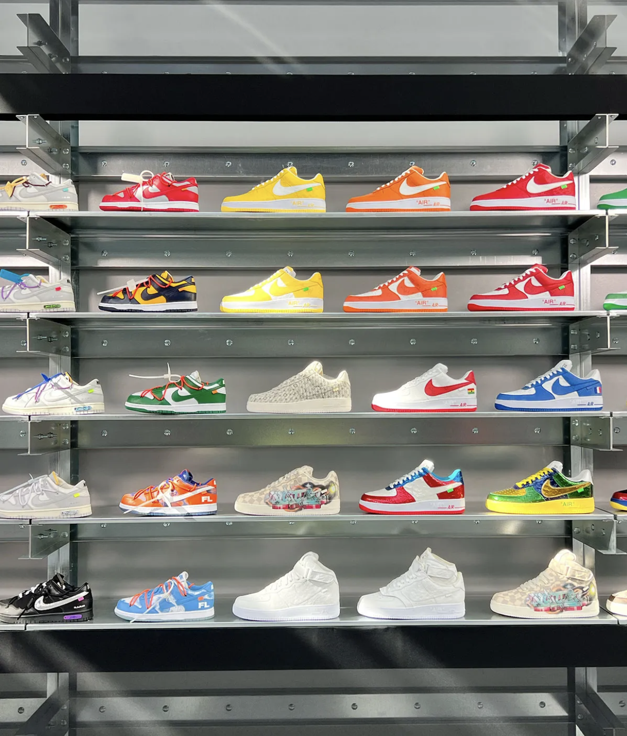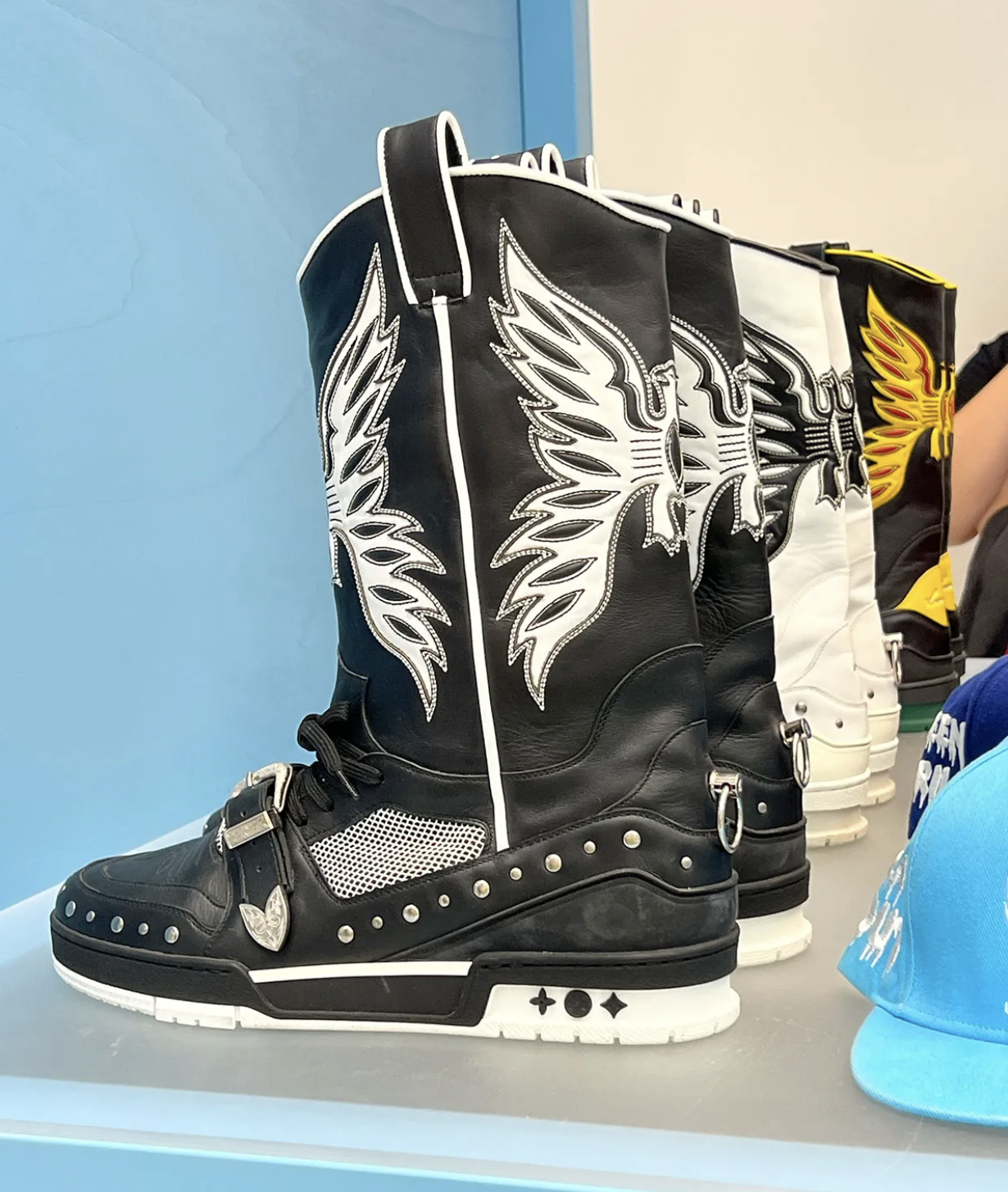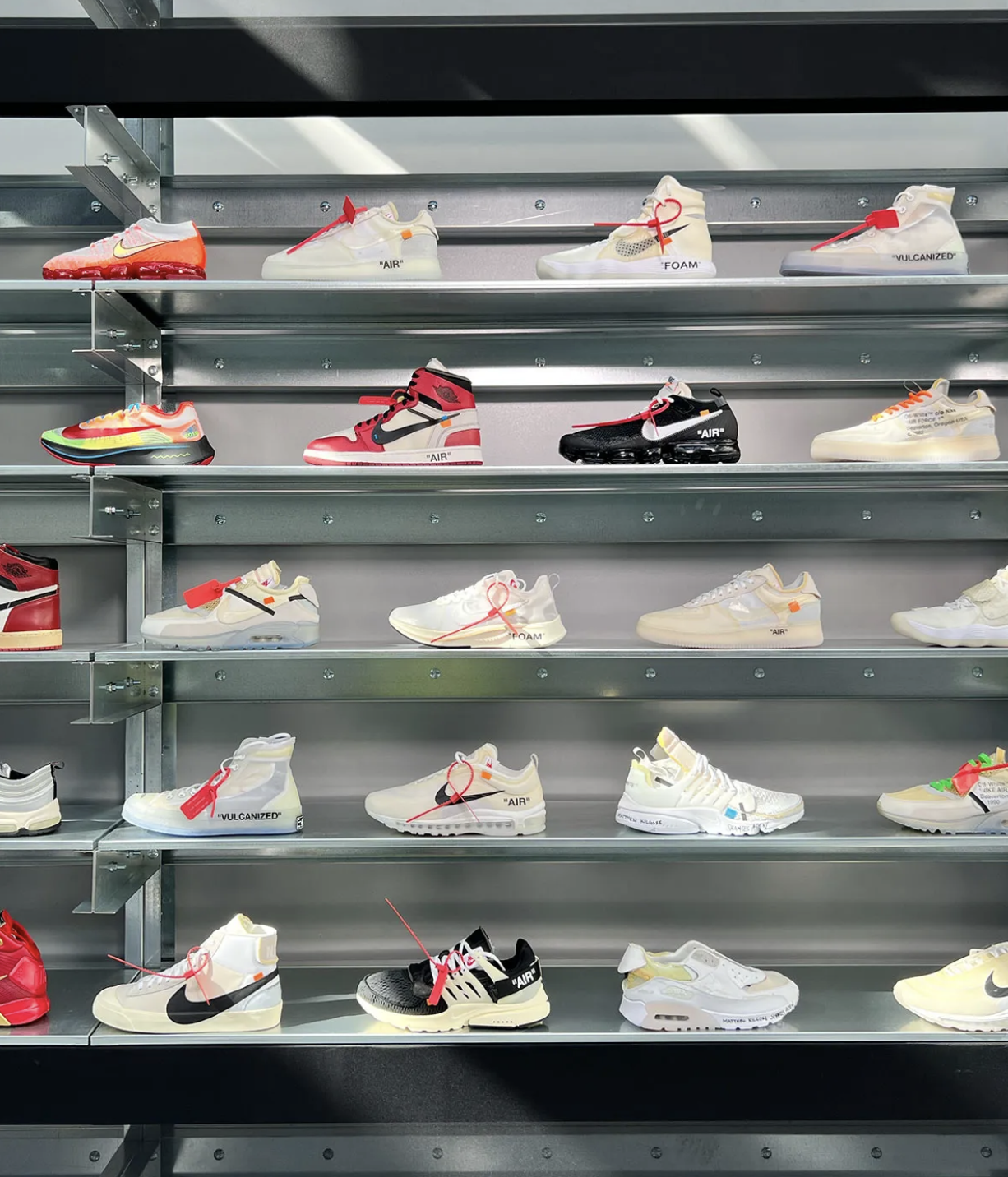 Lors de la preview, on découvre des prototypes inédits : une version “inachevée” de l’Off-White x Air Jordan 1 “Chicago” sans panneaux transparents ni Swoosh finalisé ; un modèle Nike Cryoshot Tiempo détourné, fusionnant l’esprit du terrain et l’approche Off-White ; un cowboy boot Louis Vuitton conçu par Abloh ; ainsi que des paires mythiques jamais commercialisées — entre autres les AJ4 “Bred” Off-White.