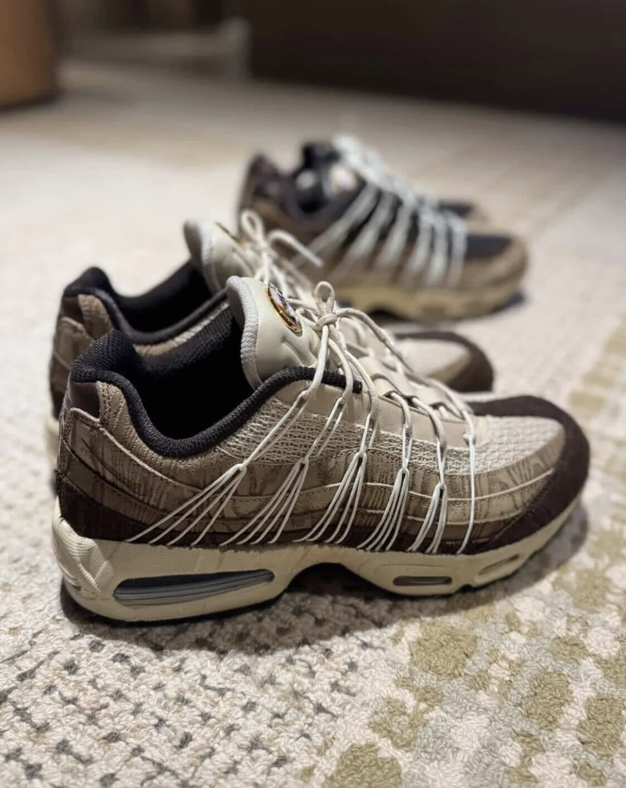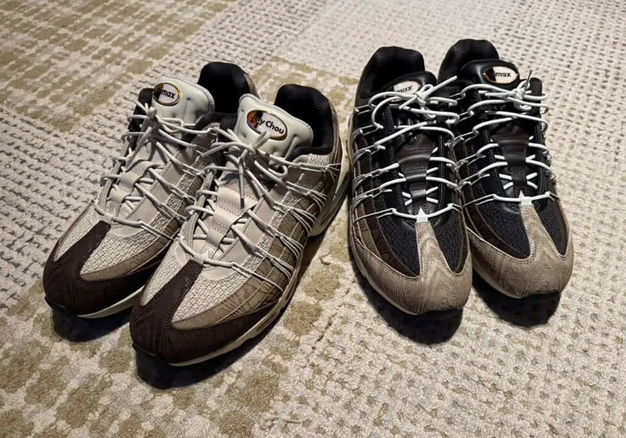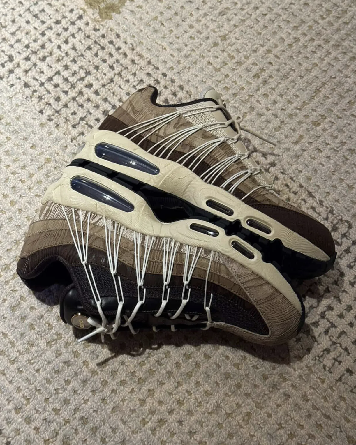 Un aperçu exclusif est apparu pour le cercle le plus restreint : la version Friends & Family de la collaboration Jay Chou x PHANTACi x Nike Air Max 95. Dans cette itération, les zones de laçage et la maille supérieure passent à un beige clair plutôt qu’au noir attendu, tandis que les panneaux latéraux dévoilent un dégradé inversé en finitions grain de bois, du clair vers le foncé. Le toe cap s’affiche en brun sombre afin de conserver un contraste visuel, et le logo “Air Max” laisse sa place au nom de Jay Chou sur l’étiquette de la languette.