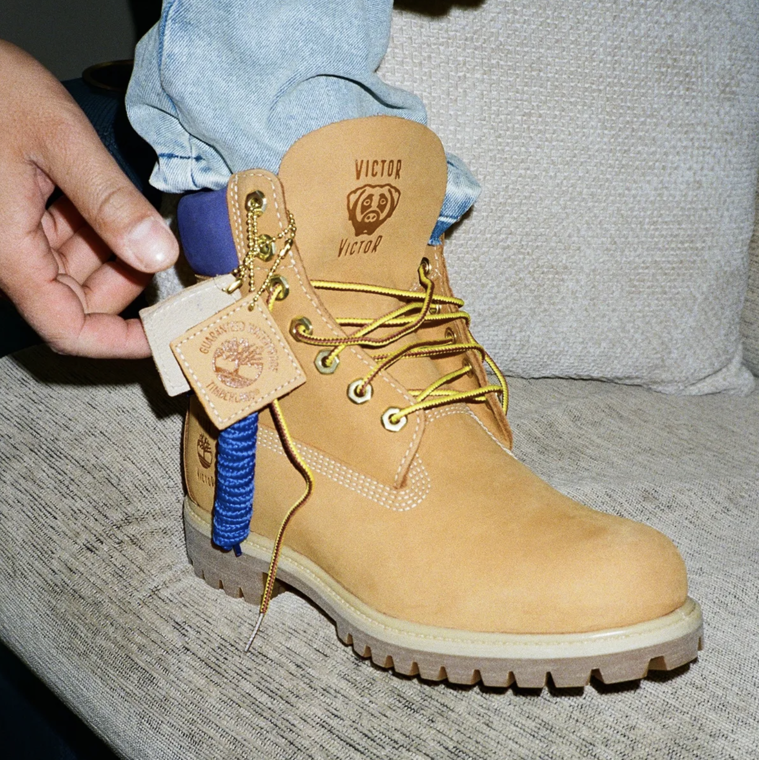 À première vue, la paire conserve tout ce qui fait la force de la 6-Inch originale : un upper en nubuck “Wheat”, des lacets corde et une semelle crantée robuste. Mais à y regarder de plus près, chaque détail trahit la patte Victor Victor. Le col en suède bleu apporte une rupture visuelle subtile, évoquant les influences de Detroit et la créativité brute de la côte Est. Sur la languette, le logo du label — un chien stylisé embossé — remplace l’arbre Timberland d’origine, tandis qu’un hangtag co-brandé en cuir parachève l’identité visuelle de la collaboration.