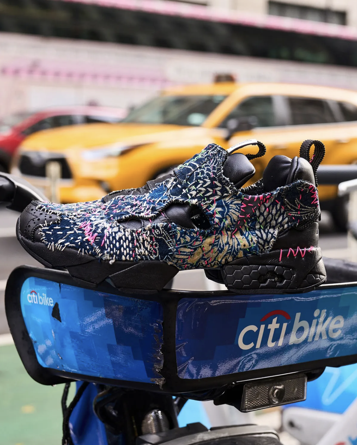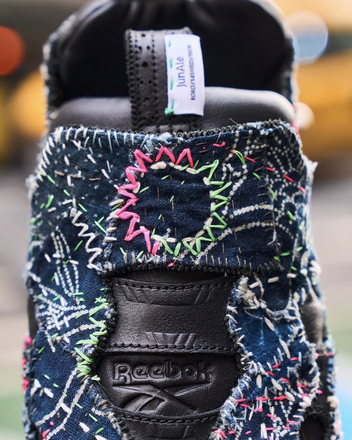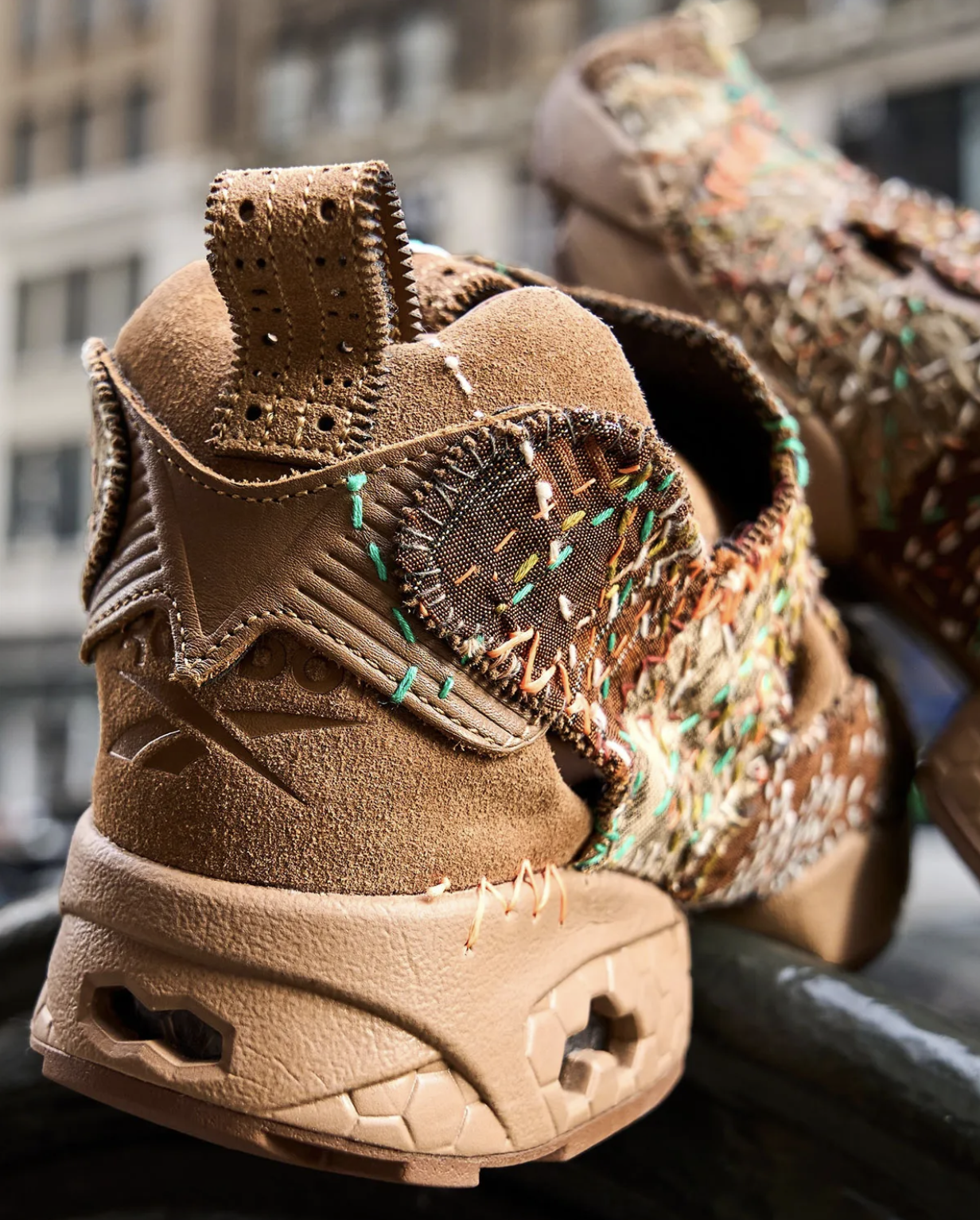 Au lieu d’une construction industrielle standard, cette Instapump Fury voit sa chambre d’air extérieure habillée de points sashiko méticuleusement cousus à la main. Chaque point raconte une histoire : répétition, renforcement, et une esthétique qui puise directement dans la philosophie japonaise du “réparer pour embellir” plutôt que remplacer. L’effet n’est pas seulement visuel — les couches de fil apportent une texture unique que seule une main expérimentée peut créer, tout en conférant au runner une dimension tactile et organique rare.