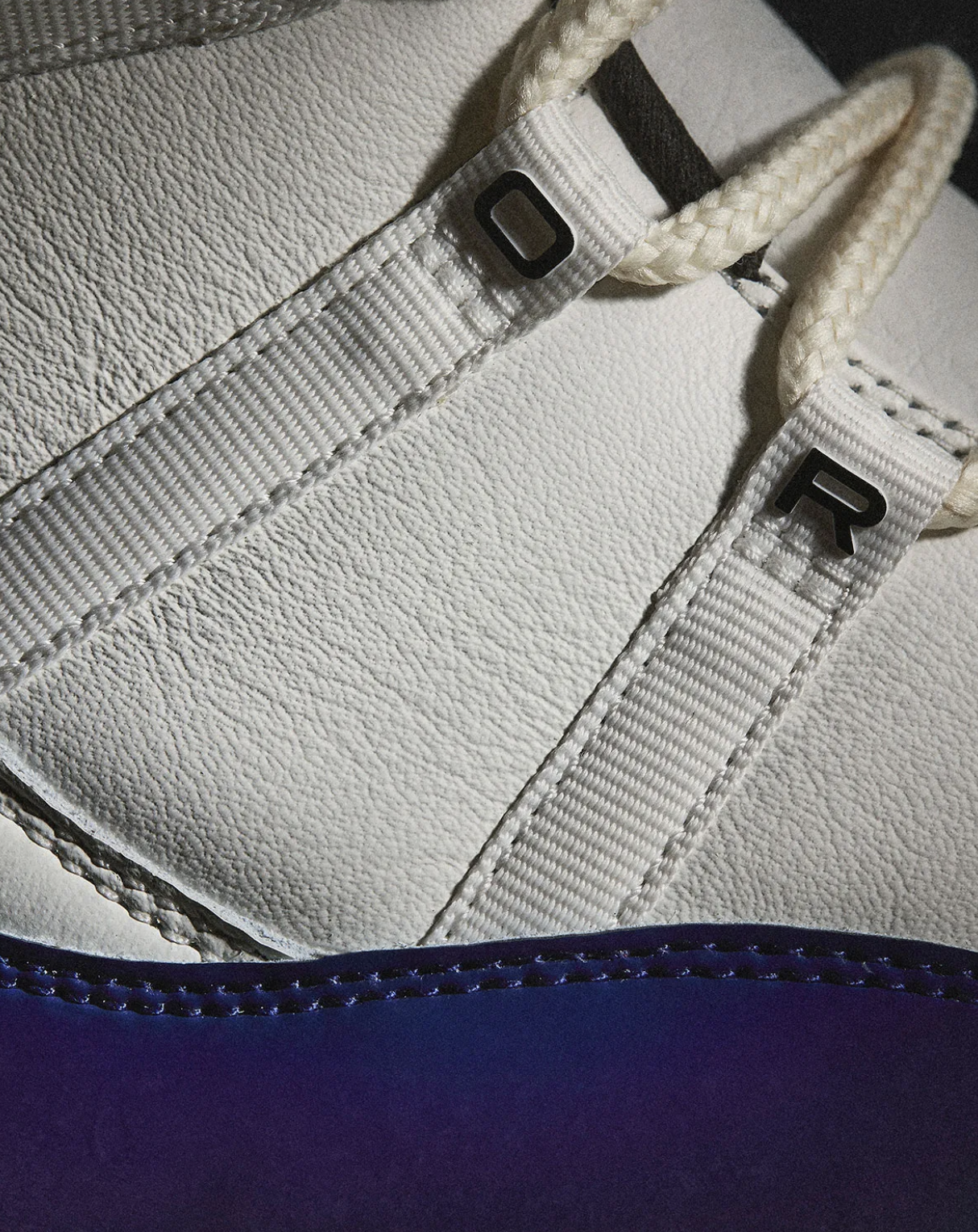 Ici, la 11 abandonne le vernis brillant pour une approche plus subtile. Le mudguard s’habille d’un bleu “Deep Royal Blue” mat, contrasté par une base blanche “Sail” et des touches de rouge “Fire Red” qui rappellent les racines Chicago. Sur les œillets, l’inscription “JORDAN” remplace le traditionnel branding du Jumpman — un clin d’œil direct aux paires d’essai réservées aux insiders de l’époque.