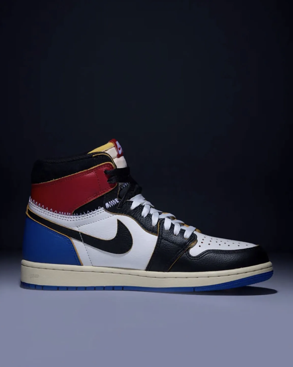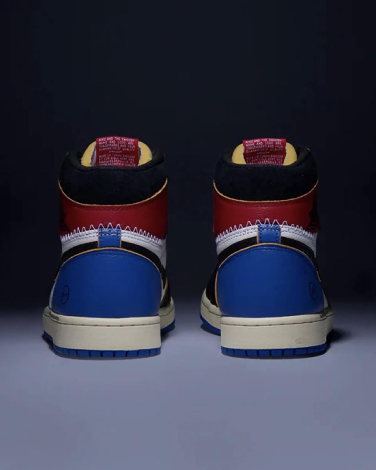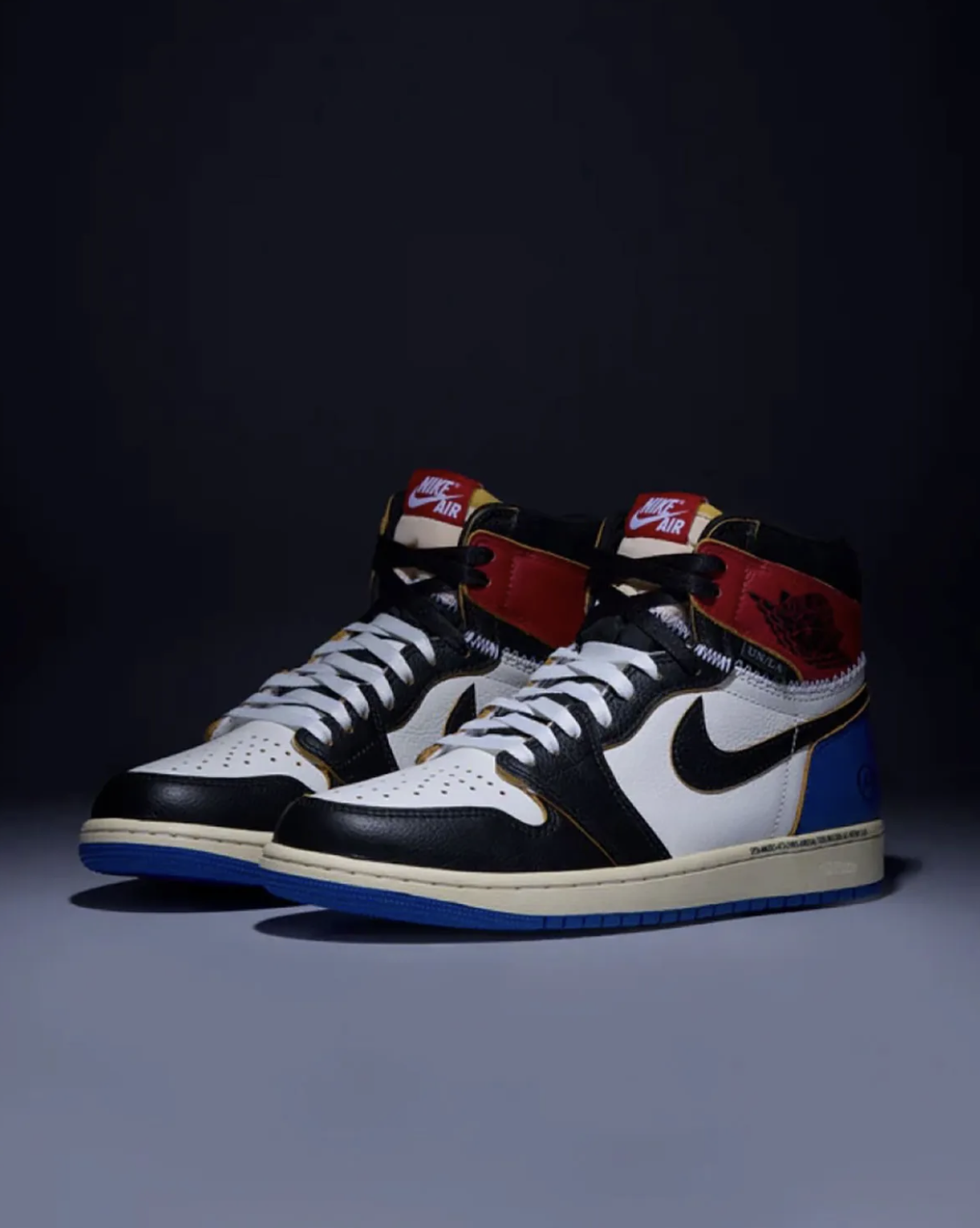 Sur le talon, la double marque — Union LA d’un côté, Fragment Design de l’autre — scelle la réunion des visions, comme une signature à trois mains apposée sur un héritage centenaire. La semelle intermédiaire, légèrement jaunie par traitement, complète ce pont visuel entre archive et modernité, faisant de cette AJ1 une sneaker à la fois historique et intemporelle.