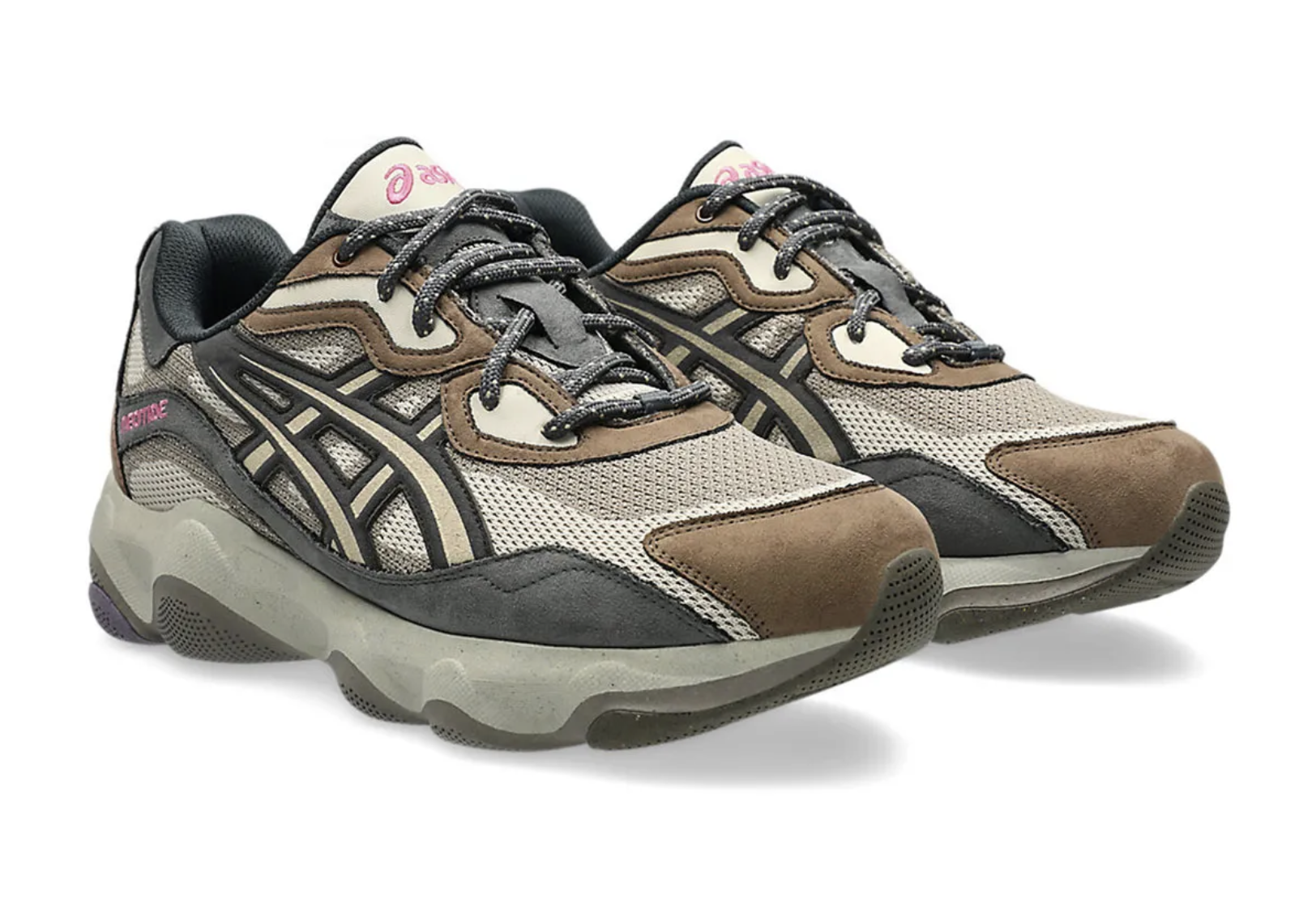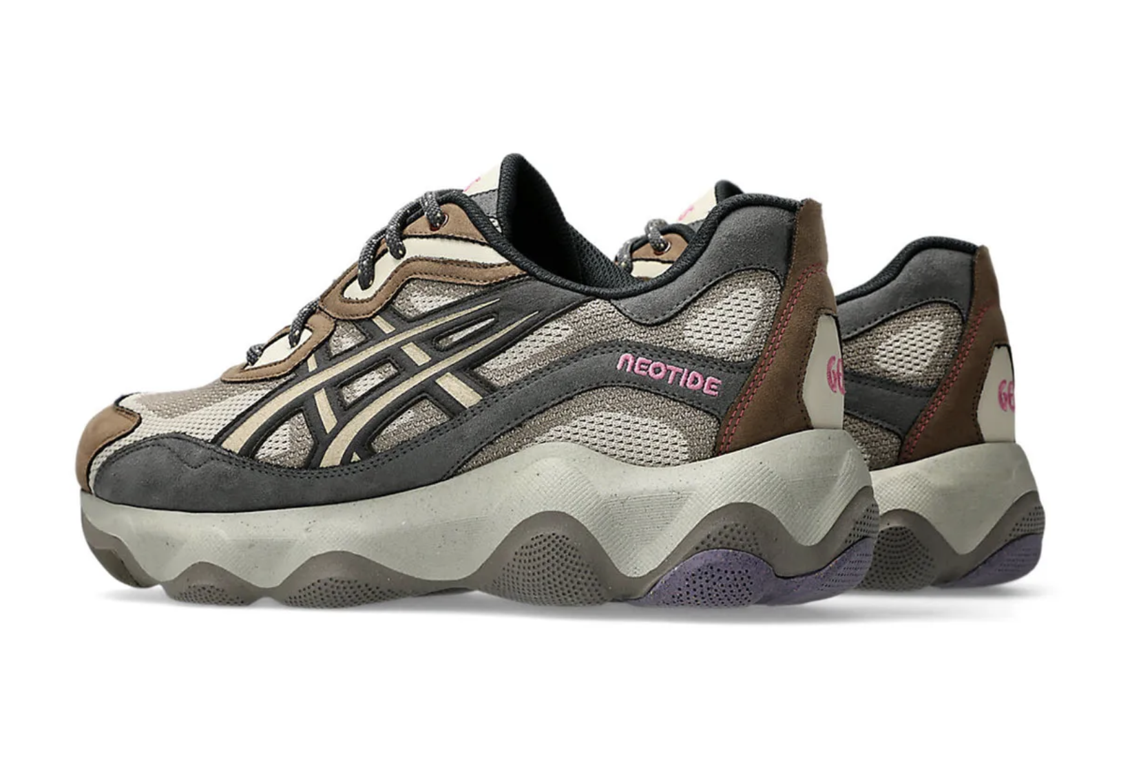 La paire repose sur une construction hybride. L’upper mêle mesh technique et textiles recyclés, issus en partie d’anciennes chaussures ASICS démontées. Sous le pied, une semelle volumineuse et sculptée rappelle les runners expérimentaux du début des années 2000, avec une esthétique presque industrielle. L’ensemble donne à la Neotide une allure massive mais cohérente, comme si chaque élément portait encore la mémoire de sa première vie.