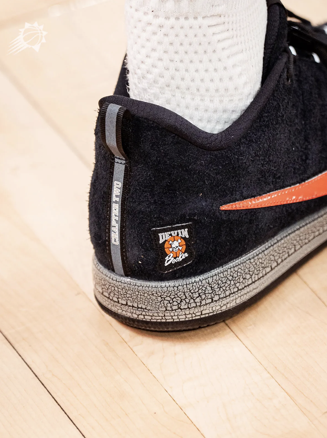 Mais c’est au talon que le storytelling s’exprime pleinement. On y retrouve une réinterprétation du célèbre logo “Bad Boys” de 1988, avec le crâne et les os croisés posés sur un ballon de basketball — ici adapté avec le nom de Booker. Un symbole fort, directement lié à l’identité de cette équipe et à son héritage.