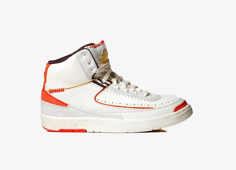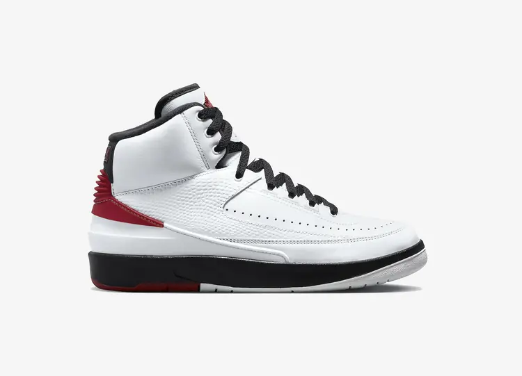 L'édition 2022 de la Air Jordan 2 Retro 'Chicago' ramène la silhouette dans sa forme originale de 1986. Le design est radicalement différent de celui de son prédécesseur : la chaussure se débarrasse du logo Nike Swoosh et introduit le logo Jordan "Wings" sur la languette. Des lacets noirs fixent une tige en cuir blanc aux lignes épurées, avec des détails perforés et une superposition en fausse peau de lézard inspirée des chaussures de luxe. Le talon cramoisi apporte une touche de couleur contrastée, tandis que le logo Nike orne le col arrière. La semelle traditionnelle est remplacée par une semelle intermédiaire en polyuréthane noir avec une semelle Air-sole encapsulée. AIR JORDAN II OG