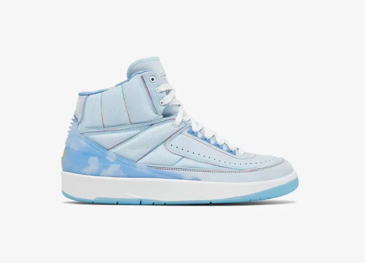 La Air Jordan 2 Retro de J. Balvin est la version fantaisiste du chanteur colombien de reggaeton de la célèbre silhouette, avec une tige en ripstop bleu poudre et des coutures multicolores contrastées. Un logo Wings phosphorescent orne la languette, tandis qu'un graphique représentant un ciel bleu nuageux orne la doublure intérieure et le talon. Ce dernier est accentué par le smiley de J Balvin. L'amorti léger est assuré par une semelle intermédiaire en polyuréthane blanc, équipée d'une semelle Air-sole encapsulée et soutenue par une semelle extérieure en caoutchouc translucide. AIR JORDAN II RETRO