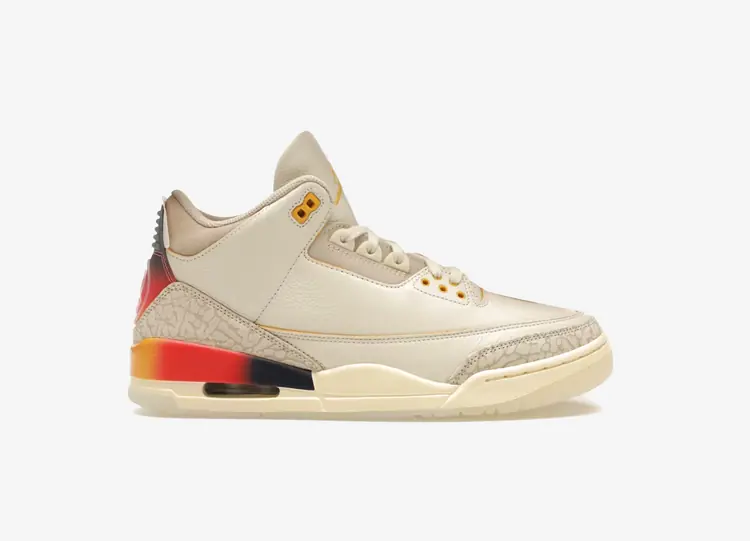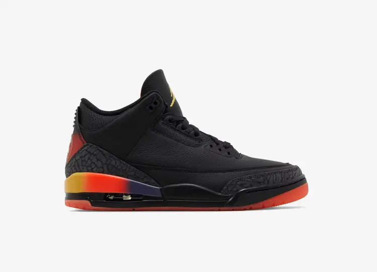La J Balvin x Air Jordan 3 Retro 'Rio' tire son nom du fils de l'artiste de reggaeton. La silhouette héritée porte une tige en cuir noir avec des superpositions d'imprimés d'éléphants gris à l'avant-pied et au talon. Des accents dégradés en Solar Flare et Total Crimson Abyss recouvrent la languette arrière, marquée par la marque Nike Air sur le pied gauche et le logo en forme de smiley de J Balvin sur le pied droit. Les couleurs du coucher de soleil sont répétées à l'arrière de la semelle intermédiaire en polyuréthane, soutenue par une semelle extérieure en caoutchouc translucide teinté de rouge. AIR JORDAN III RETRO