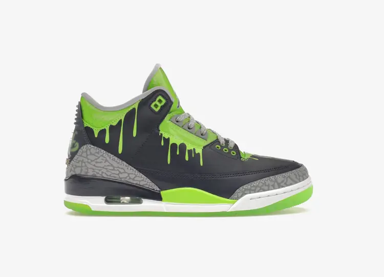 Lancée dans le cadre de la collection Doernbecher Freestyle XIX, cette Air Jordan 3 Retro a été conçue par Hugo Covarrubias Molina. Son équipe de football préférée est celle des Seahawks de Seattle, dont les couleurs se retrouvent dans le coloris de la chaussure. Fixée par des lacets phosphorescents, la tige en cuir marine présente des superpositions imprimées d'éléphants gris et un motif unique de gouttes d'eau dans une teinte verte vibrante. La languette transparente du talon affiche le logo stylisé d'Hugo, ainsi qu'un Jumpman en relief au-dessus du surnom d'Hugo, "Juice". Sous le pied, la semelle extérieure translucide teintée de vert révèle la phrase "It's OK to be different" (c'est normal d'être différent). Une étiquette plaquée or, qui peut être portée comme un pendentif sur un collier, apporte la touche finale. AIR JORDAN III RETRO