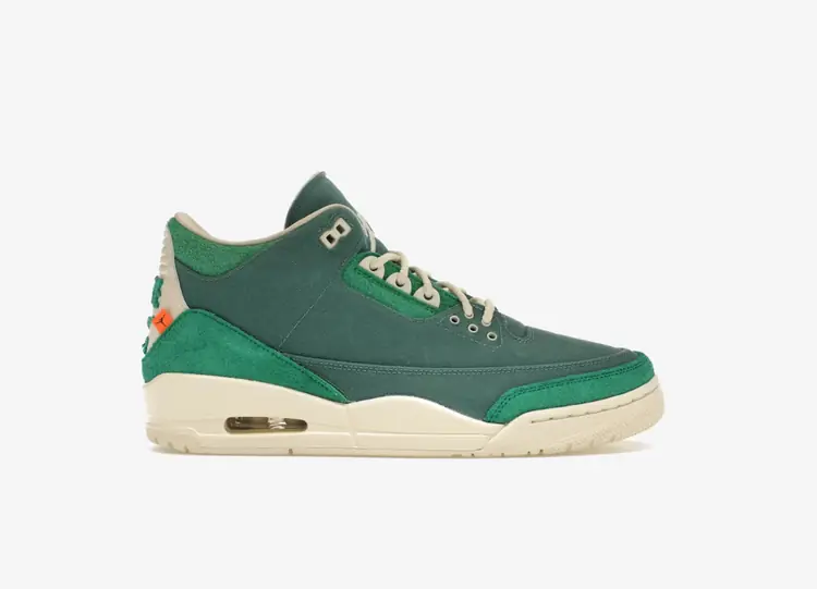 La Air Jordan 3 Retro 'Lucky Green' pour femme ajoute des accents luxuriants à la silhouette classique qui a introduit l'impression d'éléphant emblématique de Tinker Hatfield dans la ligne Jordan. Le motif distinctif apparaît sur les superpositions Cement Grey à l'avant-pied et au talon, contrastées par une tige en cuir tambouriné dans une finition blanche impeccable. Des touches vibrantes d'émeraude apparaissent sur les œillets de l'avant-pied et la semelle intermédiaire en polyuréthane de la sneaker, équipée d'une semelle Air visible au niveau du talon. La marque Jumpman orne le talon moulé et la languette, cette dernière étant agrémentée d'une touche inattendue de Varsity Red. AIR JORDAN III RETRO