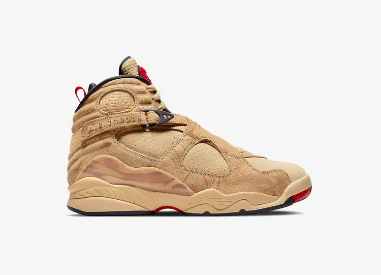 Conçue pour l'athlète de la NBA d'origine japonaise, la Rui Hachimura x Air Jordan 8 Retro SE habille la silhouette rétro d'une tige en daim beige neutre, avec des détails perforés et des superpositions à motifs ton sur ton. Les détails de la signature de la 8 restent intacts, notamment le design unique de la sangle croisée, le garde-boue imprimé et la languette en chenille, mise à jour ici en rouge avec le logo personnel de Rui. La basket repose sur une midsole en polyuréthane de couleur marron assortie, avec un coussin Nike Air encapsulé à l'avant du pied et au talon. AIR JORDAN VIII RETRO SE