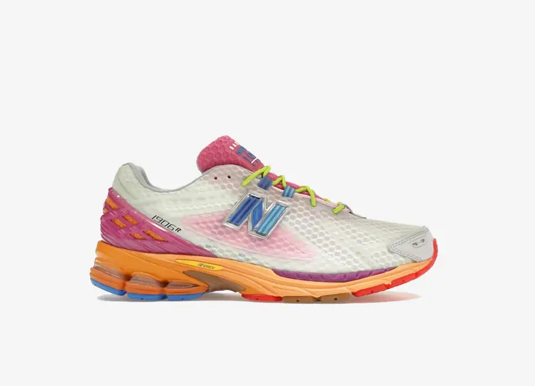La DTLR x New Balance 9060 'Fire Sign' offre un design collaboratif inspiré par un volcan en activité. Les lacets noirs maintiennent la tige, avec une base en mesh dans un mélange dégradé d'orange et de jaune. Les empiècements en daim rouge sont rehaussés d'accents argentés métalliques, assortis au logo 'N' sur le côté latéral. Cette chaussure de sport repose sur une semelle intermédiaire ABZORB, partiellement recouverte de détails mouchetés et dotée d'un amorti SBS au niveau du talon. La semelle extérieure en caoutchouc à motif de diamant offre une adhérence durable sous le pied. NEW BALANCE 9060