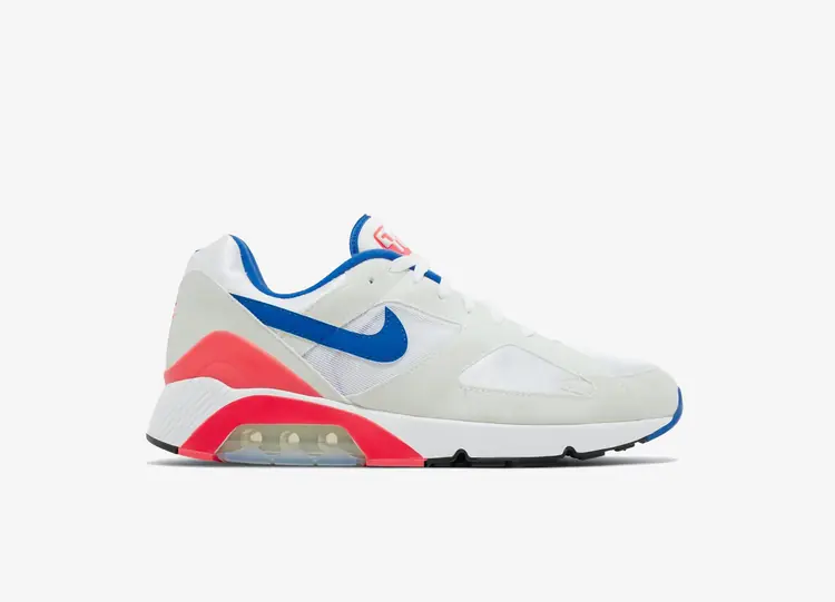 L'édition 2024 de la Nike Air Max 180 'Ultramarine' reprend le coloris OG emblématique de la chaussure de running rétro des années 90. L'empeigne combine une base textile blanche avec des superpositions en daim blanc cassé et un Swoosh en cuir bleu. Des accents rouge vif apparaissent sur le contrefort du talon en TPU, ainsi que sur la languette 180 Air et la marque Nike Air brodée à l'arrière du talon. La caractéristique principale de la chaussure est la configuration de l'amorti, mise en valeur par un amorti Air visible à 180 degrés. L'uréthane collé sur la semelle extérieure de l'unité Air lui permet de frapper littéralement le sol à chaque pas. NIKE AIR MAX 180