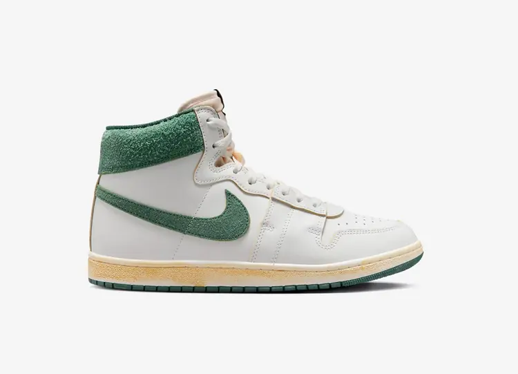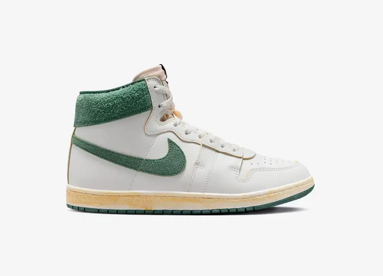 La Jordan Air Ship PE SP 'Pine Green' propose une combinaison bicolore de cette chaussure de basketball vintage que Michael Jordan a brièvement portée avant la Air Jordan 1. Conçue par Bruce Kilgore, cette sneaker montante arbore une tige en cuir blanc lisse avec une virgule emblématique dans une teinte verte luxuriante. Des accents d'émeraude assortis se posent sur le col rembourré, la doublure intérieure et l'étiquette de la languette tissée Nike Air. La sneaker repose sur une semelle cupsole en caoutchouc, mise en valeur par des flancs texturés blancs et une semelle extérieure en caoutchouc vert. NIKE AIR SHIP