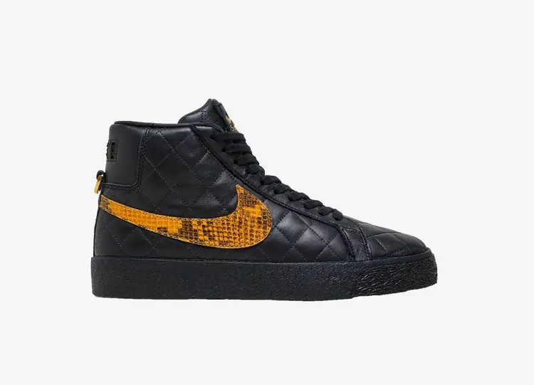 La collection 'Black Snakeskin' présente une interprétation luxueuse de la silhouette rétro. Faisant suite à la collaboration très convoitée entre les deux marques pour la Blazer en 2006, cette paire utilise une tige en cuir noir matelassé avec un Swoosh en fausse peau de serpent dans une teinte havane dorée. Un mot-symbole Nike découpé à l'emporte-pièce apparaît sur la languette du talon, tandis que la mention " Supreme " est gravée sur un anneau en D en métal fixé à une bande de talon en damier. Un double marquage orne la languette en cuir et la semelle intérieure cramoisie, avec une unité Zoom Air élastique intégrée au talon. La chaussure repose sur une semelle intermédiaire en caoutchouc vulcanisé dans une finition noire assortie. NIKE BLAZER