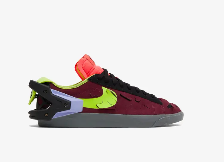 L'Acronym x Nike Blazer Low 'Night Maroon' présente l'interprétation moderniste d'Errolson Hugh de la silhouette rétro de Nike. La tige est construite en textile bordeaux avec un Swoosh jaune vif et des détails de découpe en détresse. Une talonnette moulée est rivetée à l'arrière de la low-top pour une esthétique industrielle, tandis qu'une languette en mousse apparente relie la chaussure à ses racines vintage en bois dur. La sneaker est montée sur une midsole en caoutchouc gris foncé avec un pare-chocs renforcé. NIKE BLAZER LOW