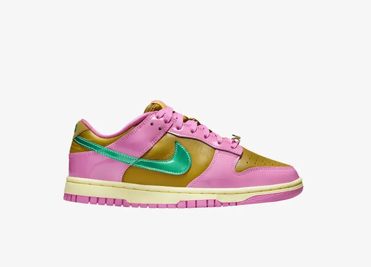 La Parris Goebel x Nike Women's Dunk Low 'Playful Pink' présente la version colorée de la silhouette classique de la Dunk, créée par la célèbre chorégraphe. La low-top est dotée d'une tige en cuir Bronzine, contrastée par du cuir verni rose sur l'avant-pied et le talon. En plus d'un Swoosh émeraude irisé, les marques comprennent des dubras Swoosh dorés et des logos Nike inversés sur la languette et la languette du talon. Une finition vintage est appliquée à la semelle intermédiaire, soutenue sous le pied par une semelle extérieure en caoutchouc rose durable. NIKE DUNK LOW