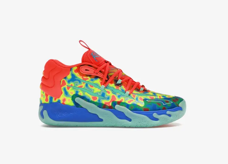 La MB.03 'GutterMelo' de PUMA est la troisième chaussure signature de LaMelo Ball dans un coloris en édition limitée conçu en collaboration avec le Gutter Cat Gang, le club social underground du web3, comme il se décrit lui-même. L'empeigne associe une maille technique dans une finition sarcelle brillante à des superpositions synthétiques multicolores bleues, vertes et écarlates. Cette dernière teinte se retrouve sur le col, les lacets et la languette, avec un graphique Gutter Cat et le marquage "Rare" de LaMelo. La semelle intermédiaire en mousse NITRO Infused est le point d'ancrage de la chaussure, soutenue par une semelle extérieure en caoutchouc antidérapante et résistante à l'abrasion. PUMA MB.03
