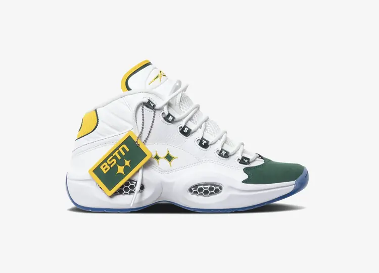 Reprenant la palette synonyme de l'école de Hampton City, l'époque où Iverson était un athlète double est imitée par le tissu choisi pour les languettes du talon, s'engageant dans un maillage jaune vif sur le pied gauche tandis que le pied droit reflète le nylon vert de son maillot de football accompagné de ses deux numéros de lycée, le n°10 et le n°3. Pour permettre aux deux dernières teintes de briller, le modèle est doté d'une empeigne en cuir blanc brillant, avec une languette en maille typique. Reflétant l'emplacement de l'embout vert en daim sur son homologue "Michigan State", le label streetwear et les logos Reebok reçoivent tous deux une bordure jaune et une étiquette de suspension - à l'exception du lettrage BSTN le long des boucles de lacet grises - avant qu'une semelle bleu glacé ne vienne apporter une finition de base sous le pied. REEBOK QUESTION MID
