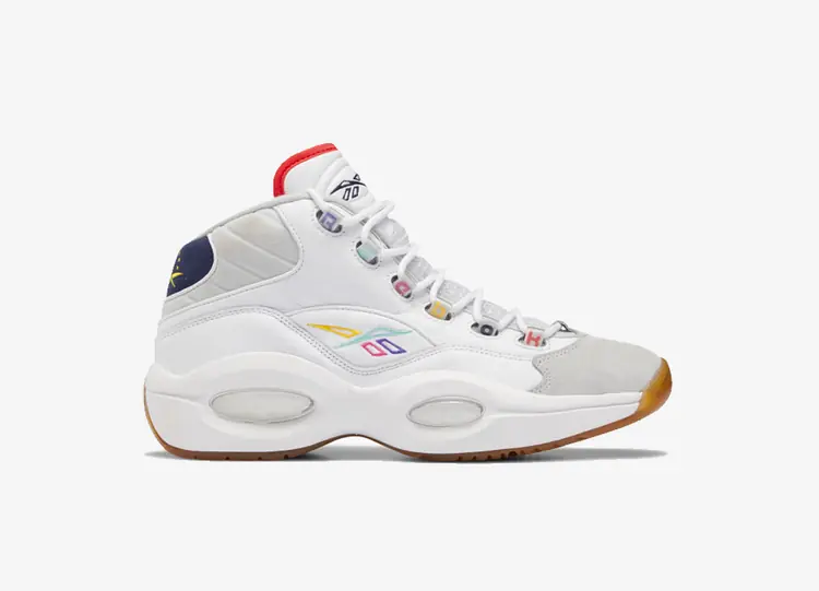 Reprenant la palette synonyme de l'école de Hampton City, l'époque où Iverson était un athlète double est imitée par le tissu choisi pour les languettes du talon, s'engageant dans un maillage jaune vif sur le pied gauche tandis que le pied droit reflète le nylon vert de son maillot de football accompagné de ses deux numéros de lycée, le n°10 et le n°3. Pour permettre aux deux dernières teintes de briller, le modèle est doté d'une empeigne en cuir blanc brillant, avec une languette en maille typique. Reflétant l'emplacement de l'embout vert en daim sur son homologue "Michigan State", le label streetwear et les logos Reebok reçoivent tous deux une bordure jaune et une étiquette de suspension - à l'exception du lettrage BSTN le long des boucles de lacet grises - avant qu'une semelle bleu glacé ne vienne apporter une finition de base sous le pied. REEBOK QUESTION MID