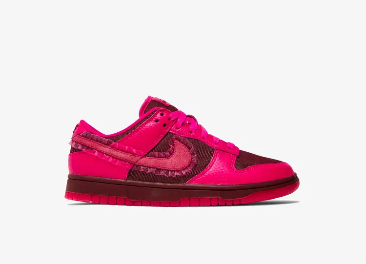 La Nike Dunk Low Valentine's Day pour femme célèbre le 14 février avec des détails à froufrous et une palette de couleurs vibrantes. Cette chaussure basse porte une tige construite en sergé textile dans une riche teinte Team Red. Les superpositions de cuir à l'avant du pied et au talon sont réalisées en Pink Prime, tandis que le Swoosh en daim poilu de couleur assortie est garni de dentelle plissée et translucide. Les mêmes teintes bordeaux et fuchsia sur le dessus se retrouvent sur la semelle en caoutchouc résistant. NIKE DUNK LOW